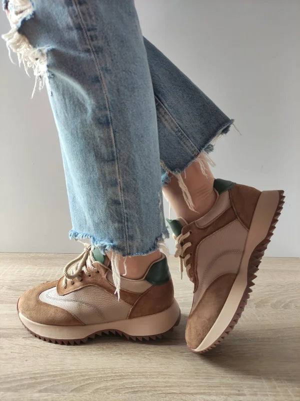 Pantofii sport de damă Formazione în nuanțe de maro și verde aduc un aer modern și natural oricărei ținute. Confecționați dintr-o combinație de piele naturală și piele naturală întoarsă, aceștia oferă atât rezistență, cât și un aspect rafinat. Designul cu talpă groasă, de 3.7 cm, și detaliile bine conturate îi transformă într-o alegere potrivită pentru purtare zilnică, asigurând confort și stabilitate. Sistemul cu șireturi permite ajustarea perfectă pe picior.