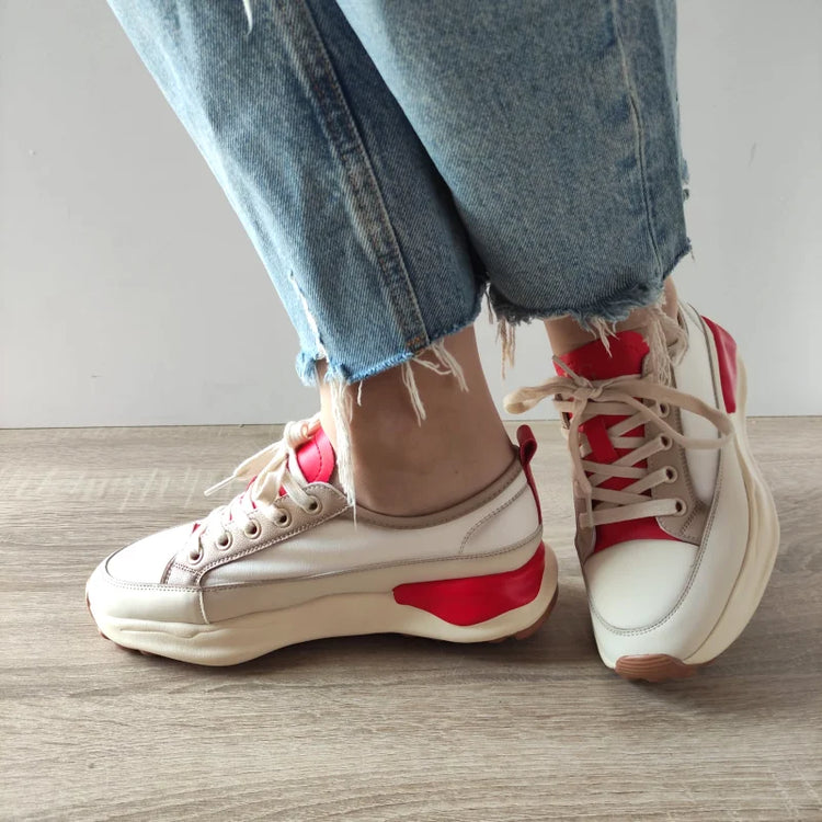 Caracteristici: Material: Piele naturală Culoare: Roșu Înălțime totală: 9 centimetri Grosimea talpii (la spate): 3.5 cm Tip închidere: Șireturi Tip produs: Pantofi sport Cod produs: 18001-3