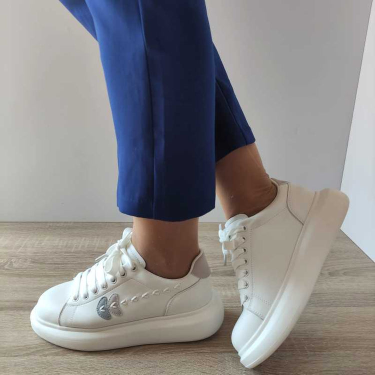 Pantofi sport damă Franco Gerardo, cod produs 2A515, realizați din piele naturală de înaltă calitate, oferă un design modern și confortabil. Culoarea alb cu accente gri îi face ușor de asortat cu orice ținută casual sau sportivă. Cu o înălțime totală de 12.5 cm și o talpă de 4.5 cm, acești pantofi sunt ideali pentru activitățile zilnice, oferind susținere și stabilitate. Sistemul de închidere cu șireturi permite o ajustare optimă pe picior.