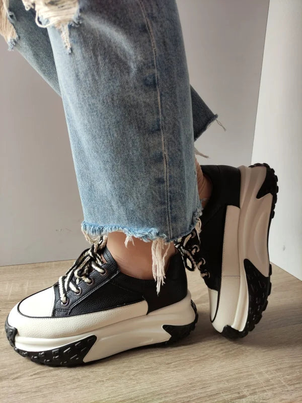 Pantofii casual de damă Franco Gerardo în combinația negru și crem ies în evidență prin designul robust și talpa înaltă, care conferă un look modern și îndrăzneț. Realizați din piele naturală, aceștia oferă confort și rezistență, fiind perfecți pentru purtare zilnică. Talpa groasă de 5.5 cm adaugă înălțime și un plus de stil, iar sistemul de închidere cu șireturi asigură fixare optimă și stabilitate.