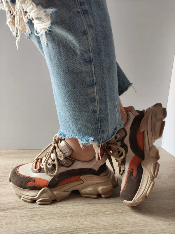 Pantofii sport de damă Franco Gerardo Y5758-2 în combinația crem cu accente orange se remarcă prin designul robust și talpa masivă, care oferă un look modern și energic. Realizați din piele naturală întoarsă, aceștia combină stilul urban cu confortul, fiind potriviți pentru ținute casual și streetwear. Talpa de 5 cm oferă un plus de înălțime și stabilitate, iar sistemul cu șireturi permite ajustarea perfectă pe picior.