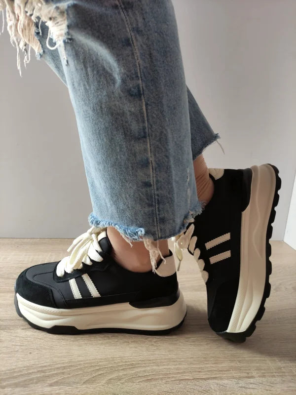 Pantofii sport de damă Franco Gerardo Y6306 în nuanța negru se remarcă prin designul modern, cu linii simple și accente albe care oferă un contrast elegant. Construiți din piele naturală, aceștia asigură rezistență și confort la purtare zilnică. Talpa masivă de 5 cm adaugă un plus de înălțime și un aer urban, potrivit pentru ținutele casual și streetwear. Sistemul cu șireturi permite ajustarea perfectă pe picior pentru stabilitate și confort.