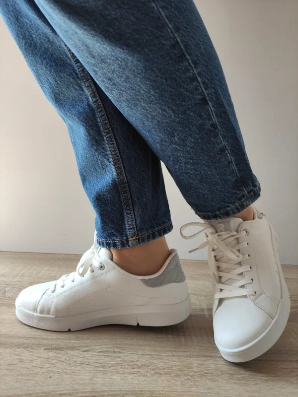 Alege un stil curat și rafinat cu acești pantofi sport Rieker, perfecți pentru plimbări, activități urbane sau ținute casual relaxate. Designul complet alb este accentuat discret în zona călcâiului de un detaliu gri deschis, oferind un contrast subtil și elegant. Realizați din piele naturală moale, acești pantofi asigură confort pe tot parcursul zilei, iar forma rotunjită a vârfului și talpa ușor înălțată oferă un plus de stabilitate și susținere. Detaliile fine și cusăturile impecabile subliniază calitatea superioară specifică brandului Rieker.