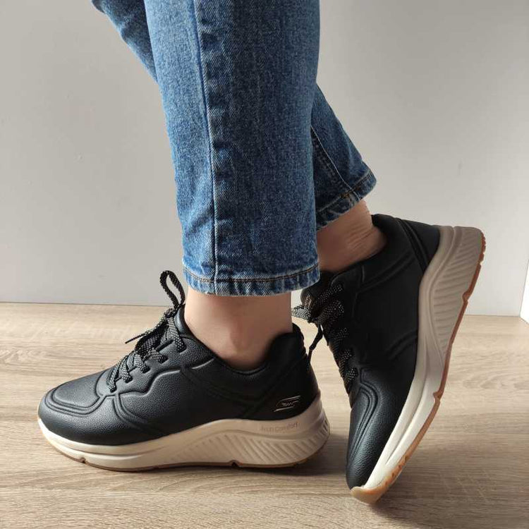 Descriere: Pantofi sport pentru damă de la Skechers, model negru, confecționați din piele ecologică. Acești pantofi sunt ideali pentru activități de zi cu zi, oferind confort datorită tehnologiei Arch Comfort și a designului sportiv, perfect pentru mișcare.