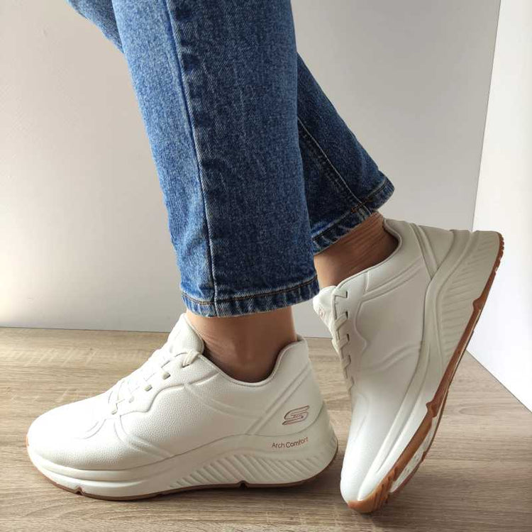 Descriere: Pantofi sport pentru damă de la Skechers, model alb, confecționați din piele ecologică. Acești pantofi sunt perfecți pentru activități zilnice, oferind confort sporit datorită tehnologiei Arch Comfort și designului sportiv, ideal pentru mișcare.
