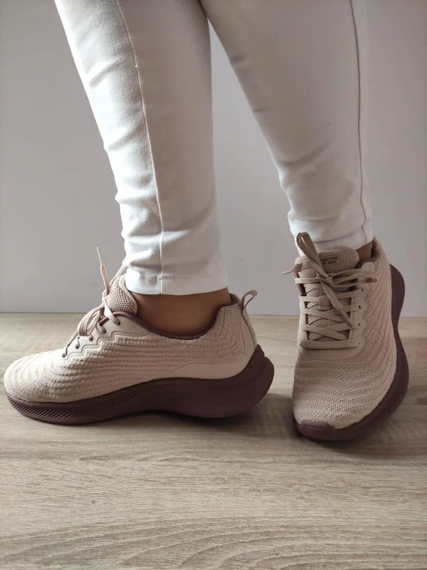 Descoperă un model care îmbină confortul absolut cu un look elegant și rafinat. Designul în nuanțe naturale, cu detalii discrete și talpă contrast în nuanță burgundy, transformă acești pantofi sport într-o alegere ideală atât pentru ținutele casual, cât și pentru cele de zi cu zi. Materialul textil respirabil se mulează perfect pe picior, iar talpa ușoară asigură o susținere excelentă la fiecare pas.