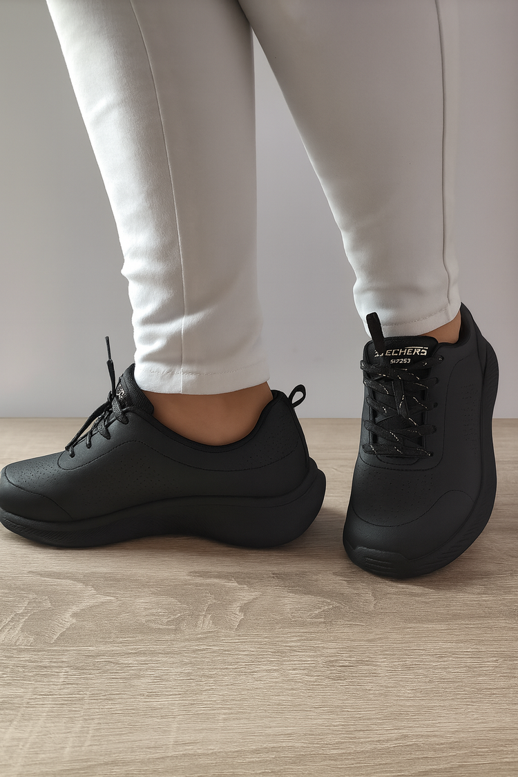 Tehnologia Skechers Slip-ins™ permite încălțarea rapidă fără efort, iar branțul cu Memory Foam asigură confort moale la fiecare pas. Talpa groasă, de 3,8 cm, oferă susținere și amortizare optimă, în timp ce înălțimea totală de 11 cm creează o postură plăcută și echilibrată.