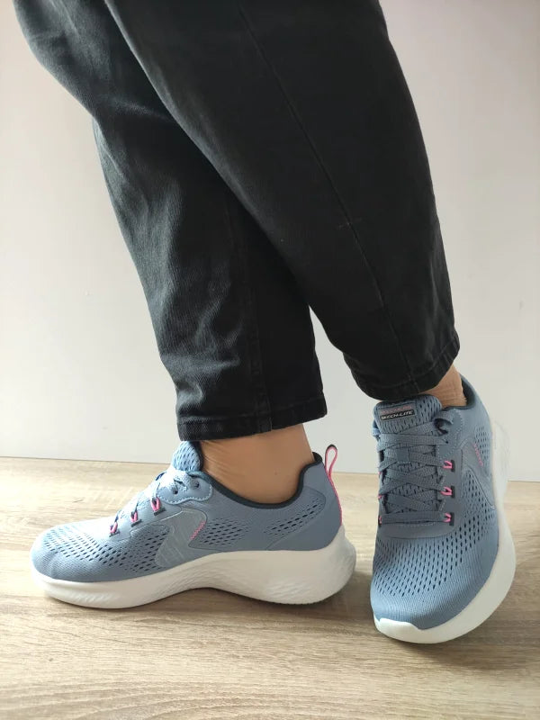 Pantofii Sport Damă Skechers 150432 în nuanța Albastru Deschis îmbină perfect stilul fresh cu funcționalitatea excelentă. Realizați din material textil respirabil, sunt echipați cu tehnologia Memory Foam Air-Cooled pentru confort maxim și ventilație optimă în timpul purtării. Talpa ușoară de 4 cm contribuie la o susținere excelentă la fiecare pas, fiind pantofii perfecți pentru activitățile zilnice sau plimbările relaxante.