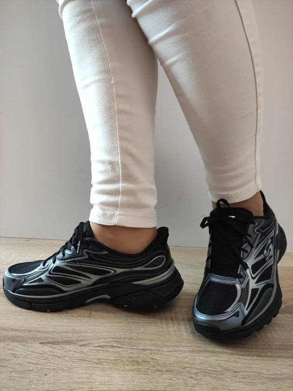 Descoperă combinația perfectă între stil și funcționalitate cu acești pantofi sport Skechers Slip-Ins. Designul din negru cu inserții argintii metalizate adaugă un aspect modern și dinamic, iar construcția Slip-Ins îți permite să îi încalți rapid, fără efort.