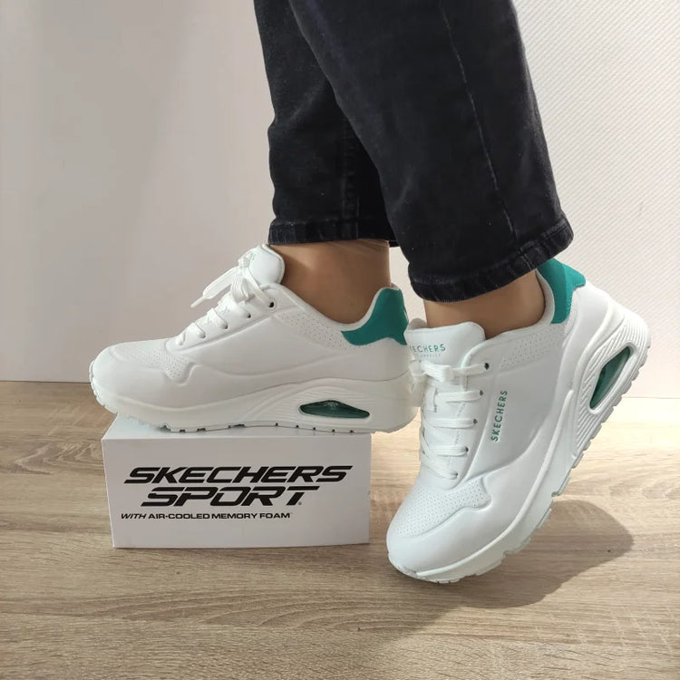 Acești pantofi sport de la Skechers sunt perfecți pentru un stil activ și dinamic, oferind un design modern și un confort de neegalat. Realizați din piele ecologică, aceștia combină un aspect elegant cu durabilitate. Talpa de 4 cm și amortizarea Air-Cooled Memory Foam asigură un confort superior pe tot parcursul zilei. Accentele verzi adaugă un plus de stil, iar sistemul de închidere cu șireturi permite o fixare optimă.