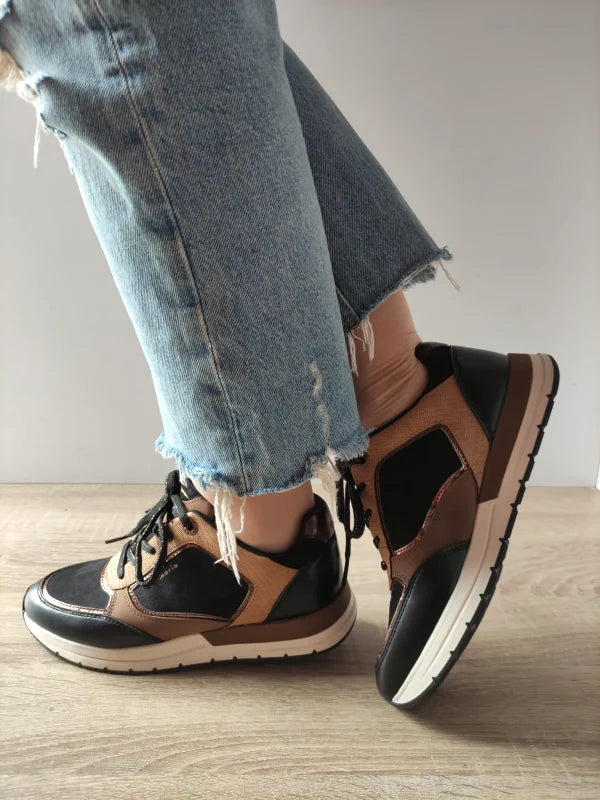 Pantofii sport de damă Tamaris 23768-45 în combinația negru și maro aduc un mix reușit între eleganță și confort. Realizați dintr-o combinație de piele ecologică și material textil, aceștia sunt practici și rezistenți, fiind perfecți pentru purtare zilnică. Designul modern, cu detalii contrastante, se potrivește atât la ținute casual, cât și la outfituri urbane. Talpa de 3 cm oferă stabilitate și confort, iar sistemul cu șireturi permite ajustarea optimă pe picior.