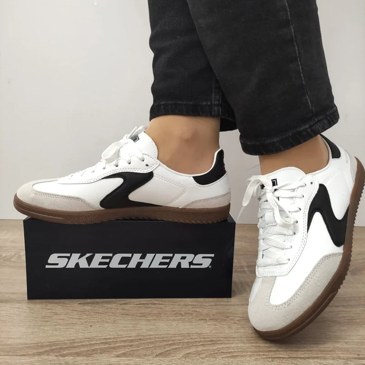 Descriere: 🤍🖤 Un look fresh, urban, cu vibe retro reinterpretat! Acești pantofi sport Skechers alb cu negru pentru tineri și nu numai, atrag imediat prin contrastul îndrăzneț și forma clasică inspirată din stilul vintage sport. Talpa gum și inserțiile negre dau personalitate perechii și o fac ușor de asortat — fie cu jeans, fie cu outfituri casual cool. 😎 Perfect pentru cei care vor ceva diferit, dar și ușor de purtat zilnic!