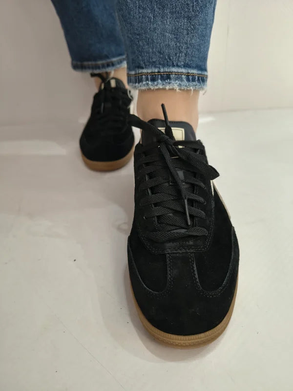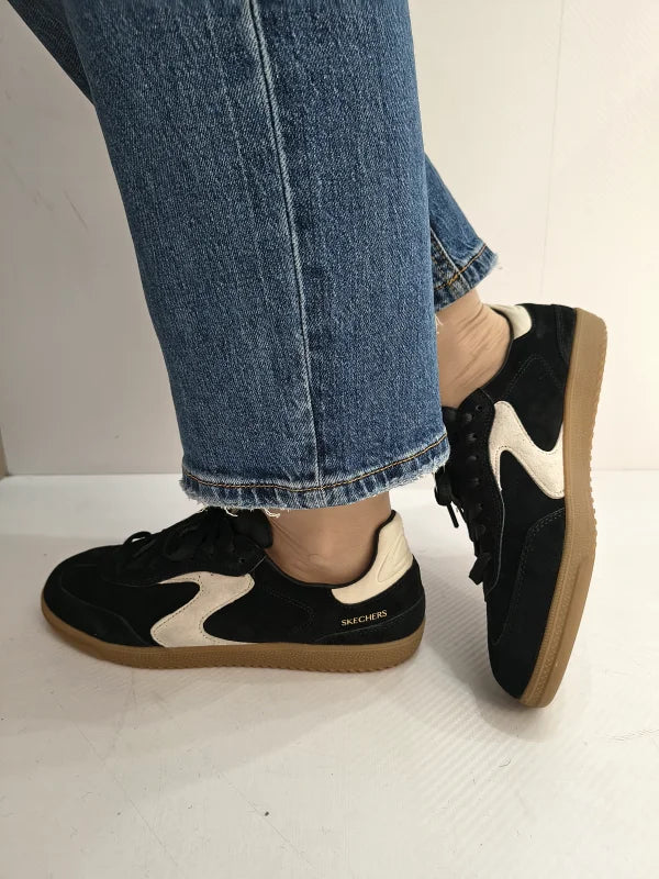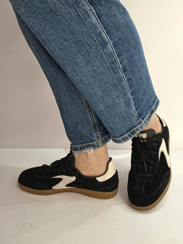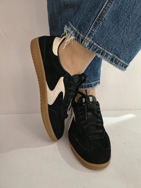 Design modern, inspirat din moda retro, într-o combinație elegantă de negru și crem. Partea superioară este realizată din piele naturală întoarsă, care oferă un aspect rafinat și o senzație plăcută la purtare. Talpa din cauciuc bej conferă aderență excelentă, iar interiorul cu branț Air-Cooled Memory Foam asigură confort pe tot parcursul zilei. Modelul se potrivește perfect cu jeanși sau ținute casual de oraș.