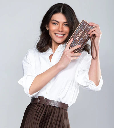 Acest portofel mare maro RFID Tribe face parte din colecția Anekke Menire, un omagiu adus colectivelor de femei indigene din Amazon.