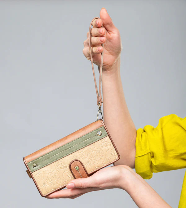 Este un portofel de marime mare. Acest model are protecție RFID: un sistem inovator de protecție care ne protejează cardurile împotriva plăților neautorizate, furtului de informații și interferențelor. Imprimeul principal este inspirat de fluturi, combinat cu spatele brodat cu forme organice. Are doua compartimente principale: spatele, unde vei gasi un portofel mare si spatiu pentru facturi sau documente. Partea superioară are fermoar, iar în interior se pot depozita monede. Întregul interior este căptușit.