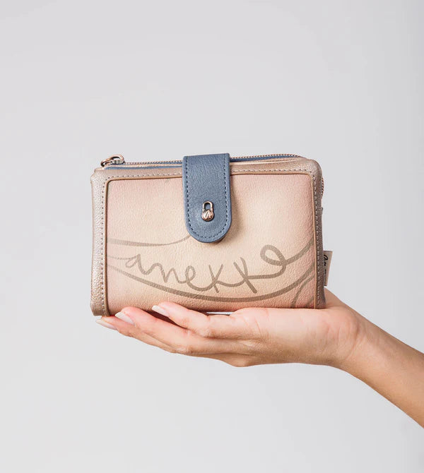 Acest portofel de dimensiune medie este realizat dintr-un material flexibil și are două compartimente principale: în partea din spate, unde vei găsi un portbani larg și spațiu pentru bancnote și/sau carduri. Se închide cu fermoar în partea superioară, iar în interior poți păstra monede. Interiorul este complet căptușit.
