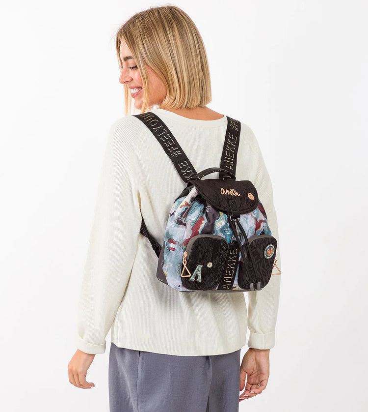 Designul ghiozdanului combină un imprimeu inspirat de o hartă a munților canadieni văzută în relief (hartă orografică), care creează unimprimeu original cu efect de camuflaj.Aceasta este amestecată cu părți ale designului în carelogo-ul Anekke devine protagonist, apărând în diferite culori, texturi și dimensiuni, creând un efect de relief.