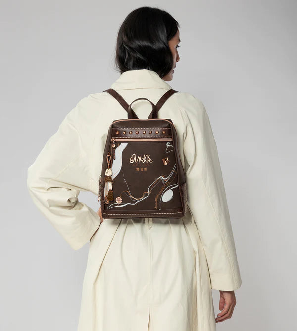 Acest rucsac mare maro de la Anekke Nature Shodō este un model foarte confortabil, cu deschidere cu fermoar și o capacitate interioară mare.Interiorul este captusit si are buzunare.Are si un buzunar pe spate si altul pe fata, ambele cu fermoar.Cele două mânere de rucsac sunt reglabile la diferite lungimi și are o curea de mână.