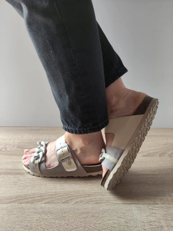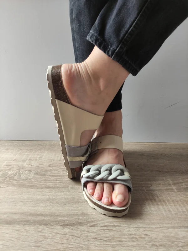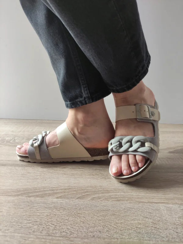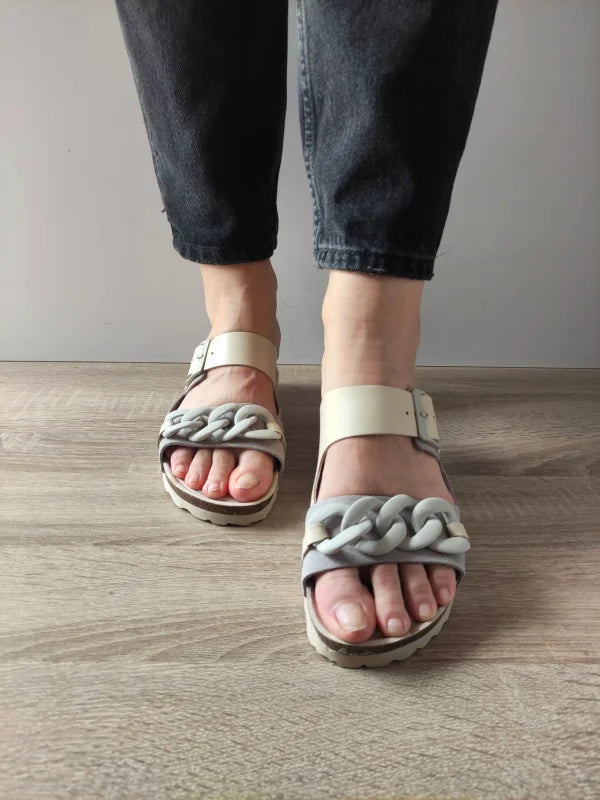 Acești saboți casual în nuanțe elegante de gri și bej adaugă un plus de rafinament oricărei ținute lejere. Designul cu baretă lată, cataramă și lanț decorativ oferă o combinație perfectă între stil și confort, iar materialele de calitate – piele naturală și piele întoarsă – asigură o purtare plăcută în zilele călduroase.