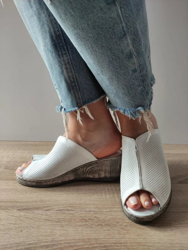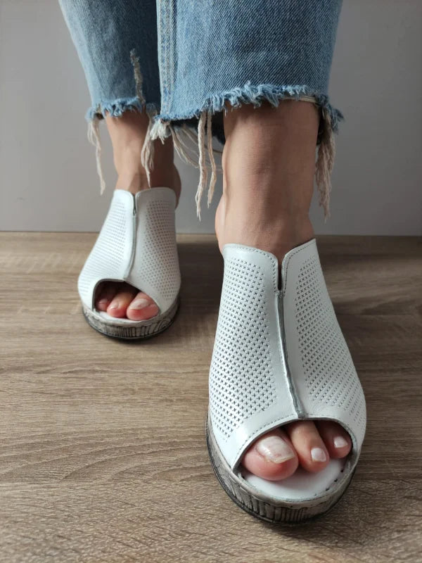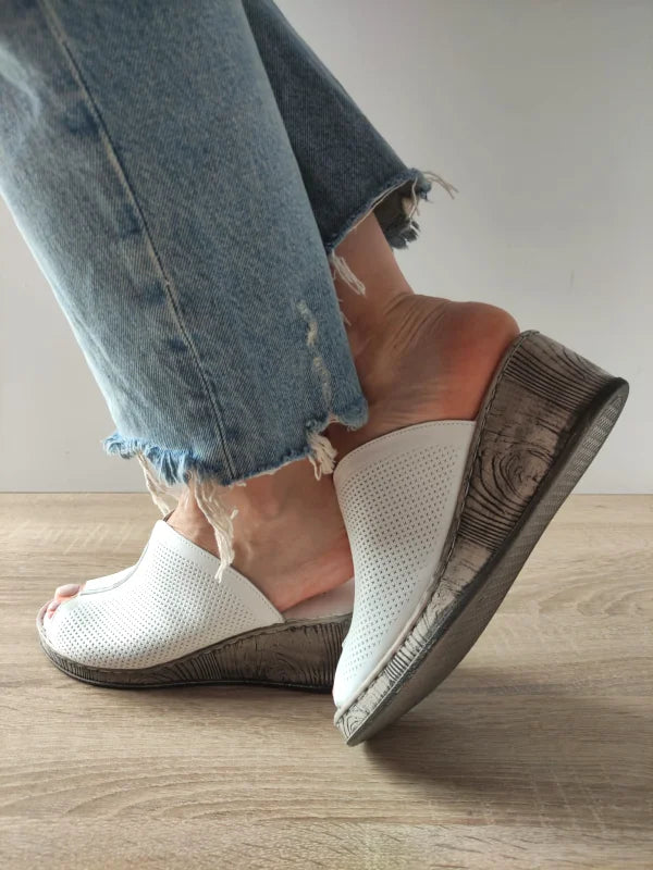 Acești saboți casual albi impresionează prin designul modern perforat și talpa cu aspect de lemn, oferind o combinație reușită între confort și stil. Forma anatomică și talpa ușor înclinată oferă susținere pe tot parcursul zilei, iar materialul din piele naturală permite piciorului să respire eficient.