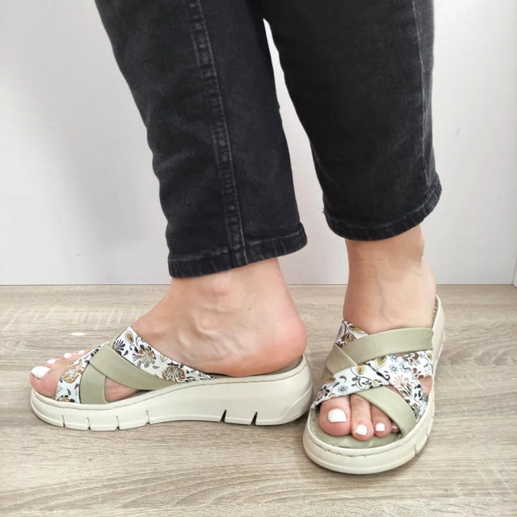 Design: Sandale casual cu un mix delicat de floral și oliv, perfect pentru zilele călduroase de vară.