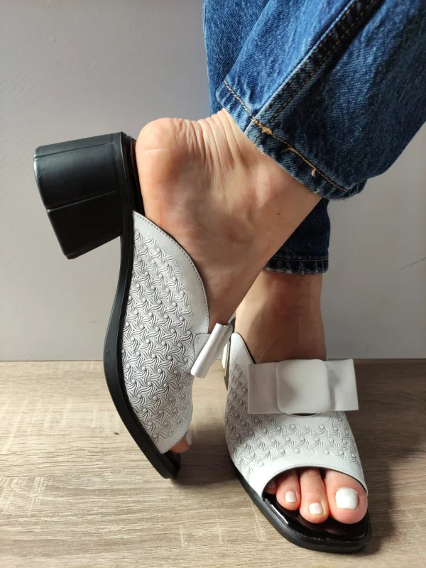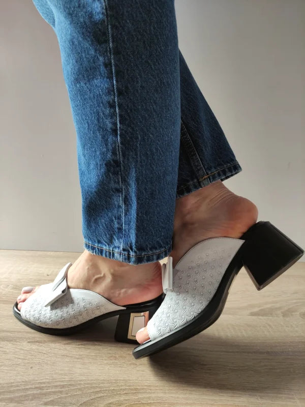 Adăugați un plus de rafinament ținutelor de vară cu acești saboți casual pentru damă de la Dogati. Modelul 9506-05 este confecționat din piele naturală albă de calitate superioară, oferind un aspect elegant și modern. Designul este îmbunătățit de un detaliu decorativ pe partea superioară și de tocul gros de 6 centimetri, care adaugă un element distinctiv și sofisticat. Sistemul slip-on facilitează încălțarea rapidă și ușoară, iar talpa de 2 centimetri asigură un confort optim.