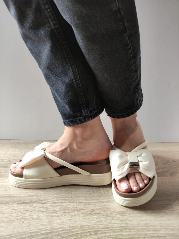 Descriere: Sabotii casual de damă Formazione TP637-1, în nuanța elegantă crem, se remarcă printr-un design feminin și jucăuș, ideal pentru ținutele de vară. Realizați dintr-o combinație de piele naturală și satin fin, acești saboți slip-on atrag atenția prin fundă decorativă de mari dimensiuni, accentuată de un detaliu metalic central. Talpa ușor înălțată oferă confort la mers, iar bareta suplimentară subțire adaugă stabilitate și echilibru estetic. O alegere inspirată pentru femeile care vor un model confortabil, dar cu un aer deosebit.