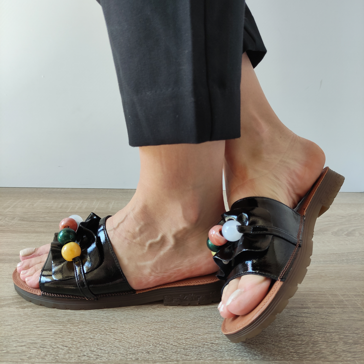 Acești saboți casual pentru damă de la Otter sunt ideali pentru sezonul de vară, oferind un aspect elegant și modern. Modelul Pass 440016A1-I este confecționat din piele naturală lăcuită de culoare negru, cu un design atractiv evidențiat de mărgele decorative colorate în partea frontală. Sistemul slip-on asigură o încălțare rapidă și ușoară, iar talpa confortabilă de 2 centimetri oferă suport pe durata întregii zile. Înălțimea totală a pantofului de 8.5 centimetri adaugă un plus de stil oricărei ținute casual.