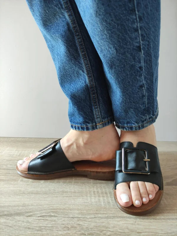 Simpli, eleganți și practici, acești saboți casual negri sunt alegerea perfectă pentru ținutele de vară. Catarama supradimensionată adaugă un accent modern și atrăgător, iar pielea naturală moale asigură confort pe tot parcursul zilei. Pot fi purtați ușor datorită designului slip-on cu baretă lată.