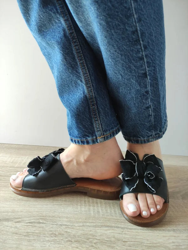 Acești saboți casual negri adaugă un strop de romantism oricărei ținute de vară. Florile aplicate manual din piele naturală creează un efect vizual deosebit, iar baretă lată oferă stabilitate și confort. Talpa joasă, flexibilă și ușoară îi face perfecți pentru plimbări relaxante și purtare zilnică.