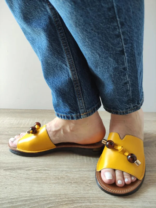 Plini de viață și stil, acești saboți casual galbeni aduc un accent vesel oricărei ținute estivale. Construiți din piele naturală, se remarcă prin aplicațiile cu mărgele elegante, care atrag atenția discret. Talpa joasă și flexibilă oferă confort, fiind perfecți pentru zilele călduroase de vară și plimbări relaxante.