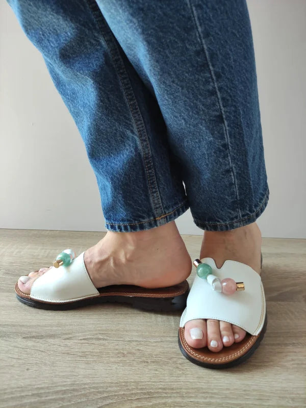 Eleganți și jucăuși, acești saboți albi ies în evidență prin aplicațiile cu mărgele colorate, care adaugă o notă delicată și feminină. Construiți din piele naturală, sunt ușor de purtat și potriviți pentru zilele călduroase, datorită tălpii flexibile și confortabile. Un model ideal pentru ținute lejere sau casual chic.