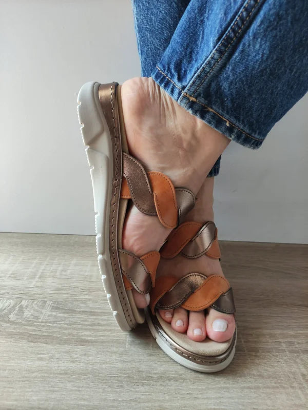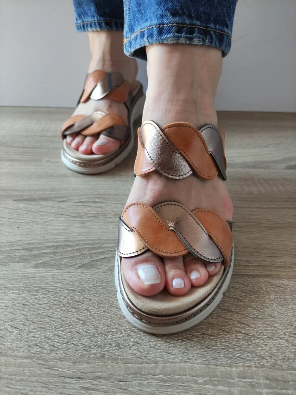 Acești saboți casual Suave sunt combinația perfectă dintre confortul pur și un design elegant. Realizați din piele naturală în nuanțe calde de maro și auriu, aceștia se remarcă prin baretele împletite care oferă un aspect modern și plăcut vizual.