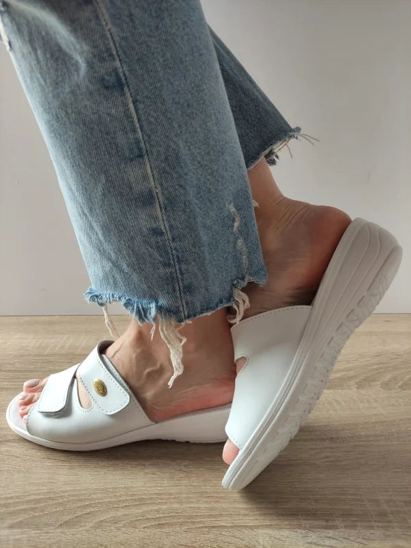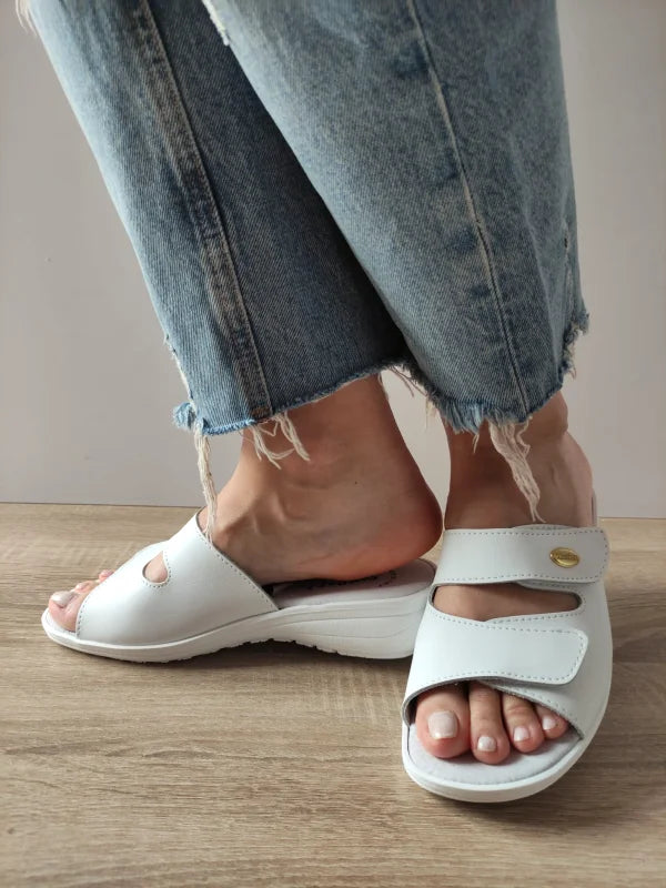 Perfecți pentru activități îndelungate în picioare, acești saboți medicali Comoda sunt realizați din piele naturală albă și oferă un nivel excelent de confort și susținere. Cele două barete reglabile cu velcro (scai) permit ajustarea rapidă și precisă pe orice formă a piciorului.