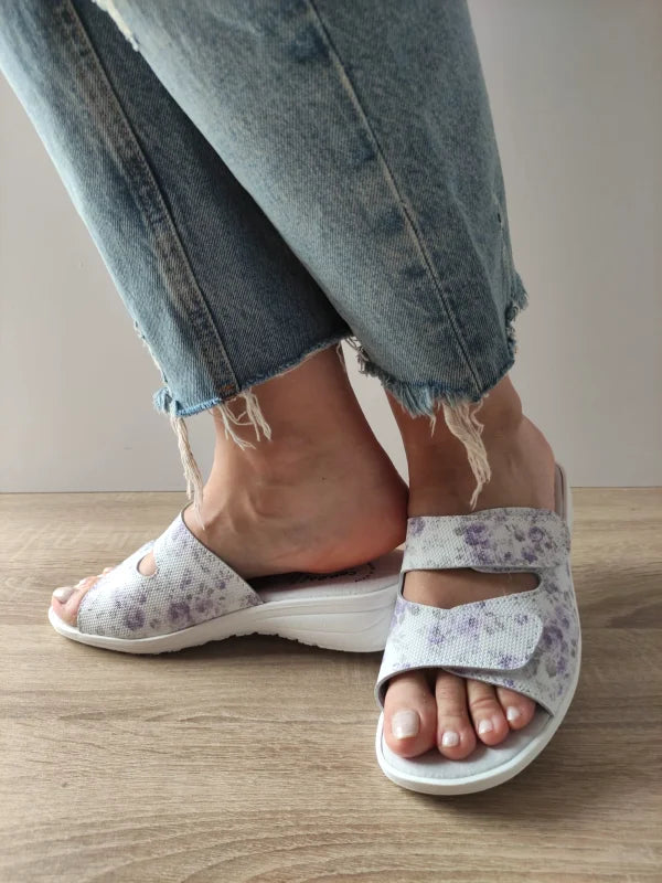 Confort și feminitate într-un model practic – acești saboți medicali Comoda sunt realizați din piele naturală cu imprimeu floral în nuanțe de alb și lila, oferind o notă delicată uniformelor clasice.