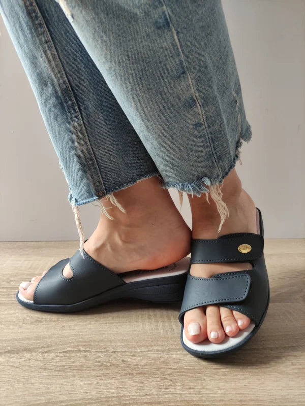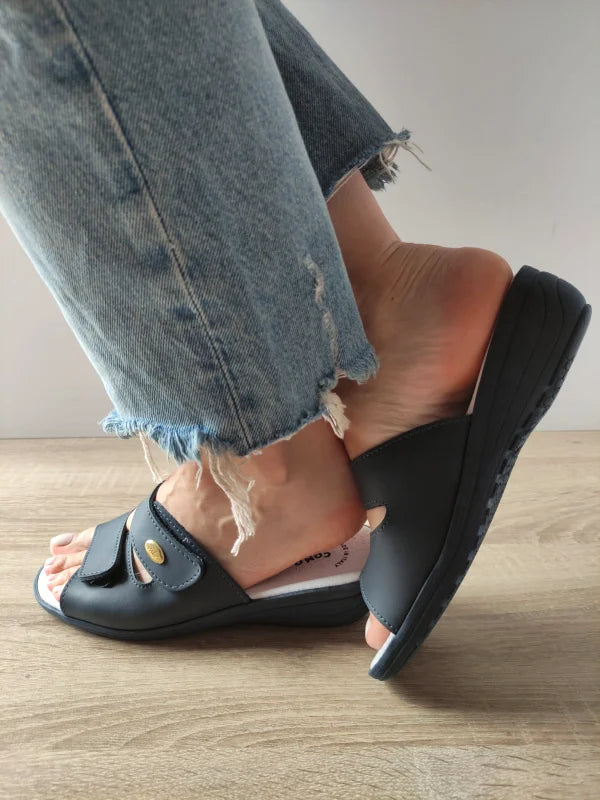Acești saboți medicali Comoda în nuanță bleumarin sunt alegerea perfectă pentru confort și susținere pe parcursul întregii zile. Realizați din piele naturală, cu două barete cu închidere velcro (scai), permit reglarea rapidă și eficientă pentru o fixare sigură și personalizată.