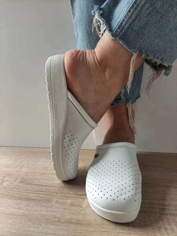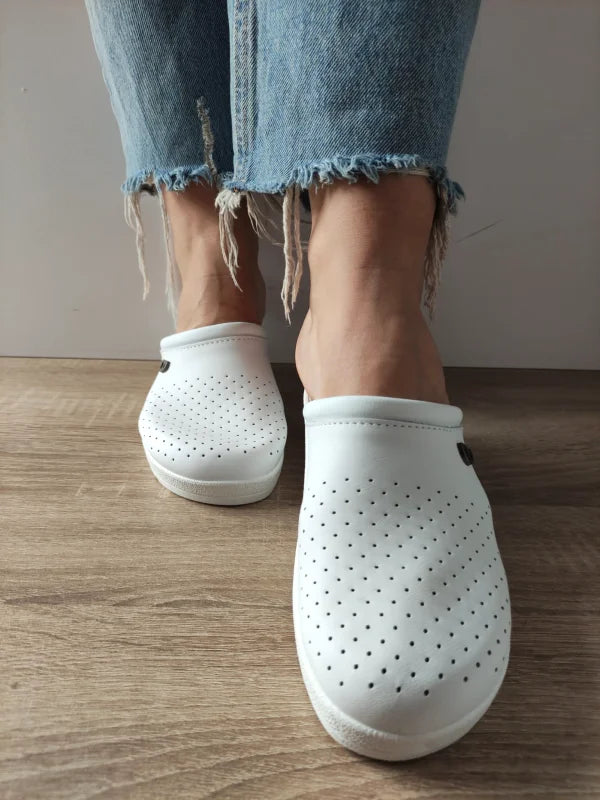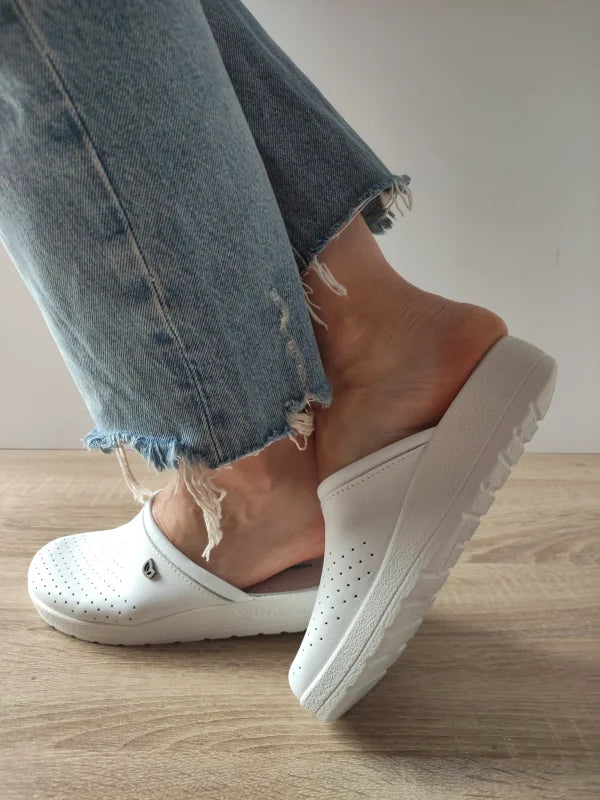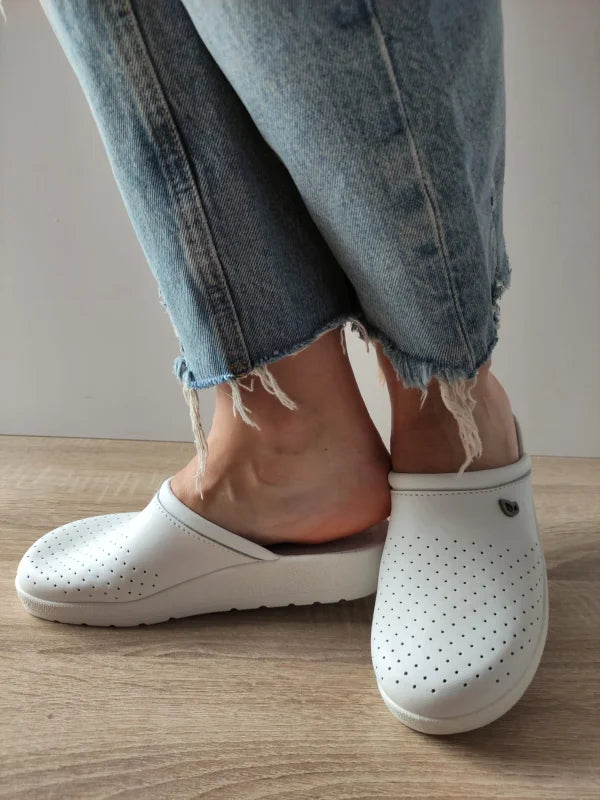 Acești saboți medicali albi de la Eco Bio sunt creați special pentru a asigura confort și sprijin pe tot parcursul zilei. Construiți din piele naturală de înaltă calitate, aceștia oferă respirabilitate excelentă prin perforațiile frontale, menținând piciorul uscat și confortabil.