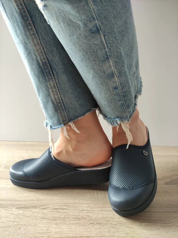 Acești saboți medicali bleumarin de la Eco Bio sunt alegerea ideală pentru persoanele care caută confort maxim în timpul orelor lungi de stat în picioare. Realizați din piele ecologică stretch, se mulează perfect pe forma piciorului, oferind flexibilitate și susținere fără puncte de presiune.