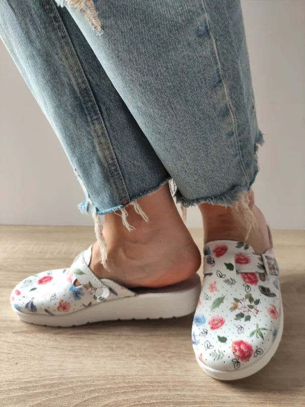 Îmbină eleganța florală cu confortul profesional în acești saboți medicali Eco Bio, realizați din piele naturală albă cu un imprimeu floral discret și vesel. Prevăzuți cu sistem de memorie plantară, aceștia oferă susținere optimă și confort personalizat chiar și în cele mai solicitante zile.