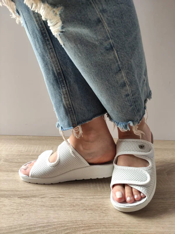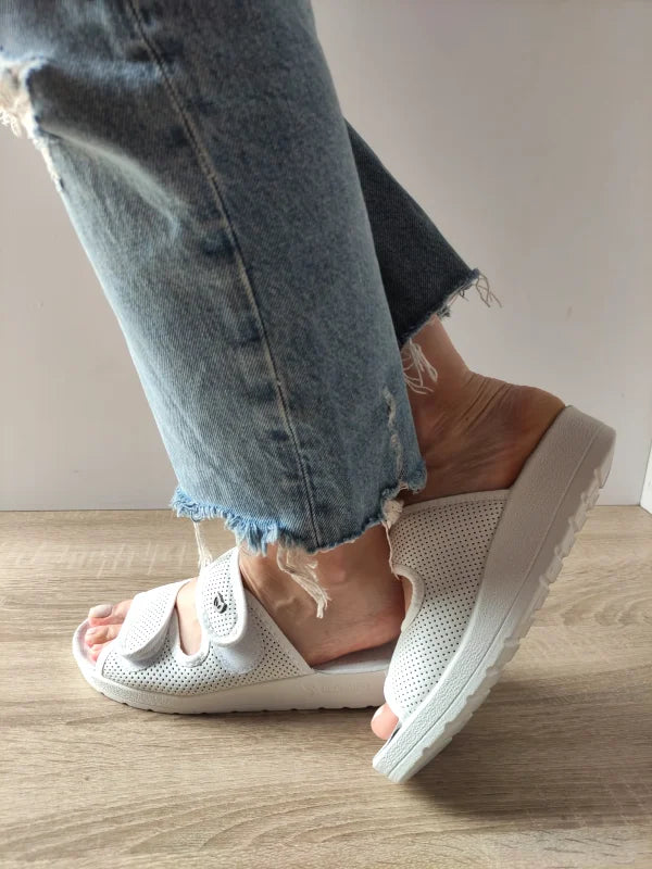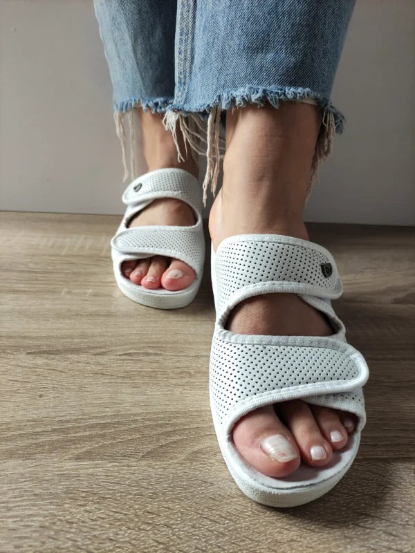 Datorită celor două benzi cu închidere Velcro (scai), saboții permit ajustarea perfectă pe lățimea piciorului. Perforațiile ajută la o bună aerisire, făcând acest model o alegere ideală pentru cadre medicale și personal din domeniul farmaceutic.