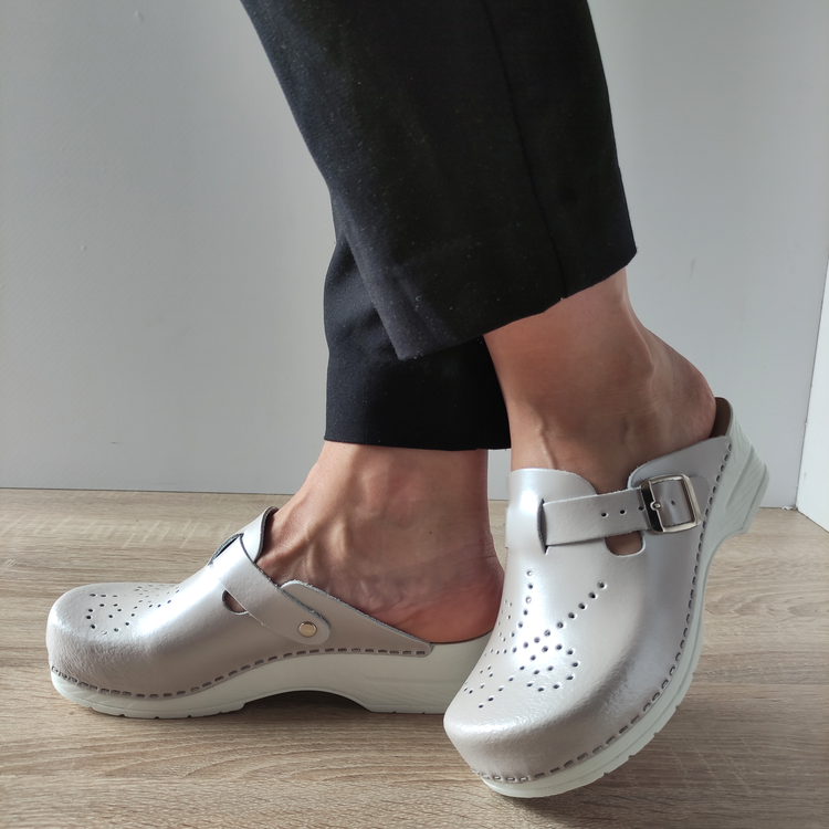 Îți prezentăm saboții medicinali pentru damă de la Fratelli, modelul D-101. Acești saboți sunt confecționați din piele naturală de culoare roz nude sidef, oferind un aspect elegant și funcțional. Designul acestora este special conceput pentru a oferi confort și suport pe durata întregii zile, fiind ideali pentru utilizarea în medii medicale sau pentru persoanele care petrec mult timp în picioare. Sistemul de închidere slip-on asigură o încălțare rapidă și confortabilă. Talpa de 4.5 centimetri și înălțimea totală a pantofului de 10 centimetri oferă stabilitate și susținere optimă.