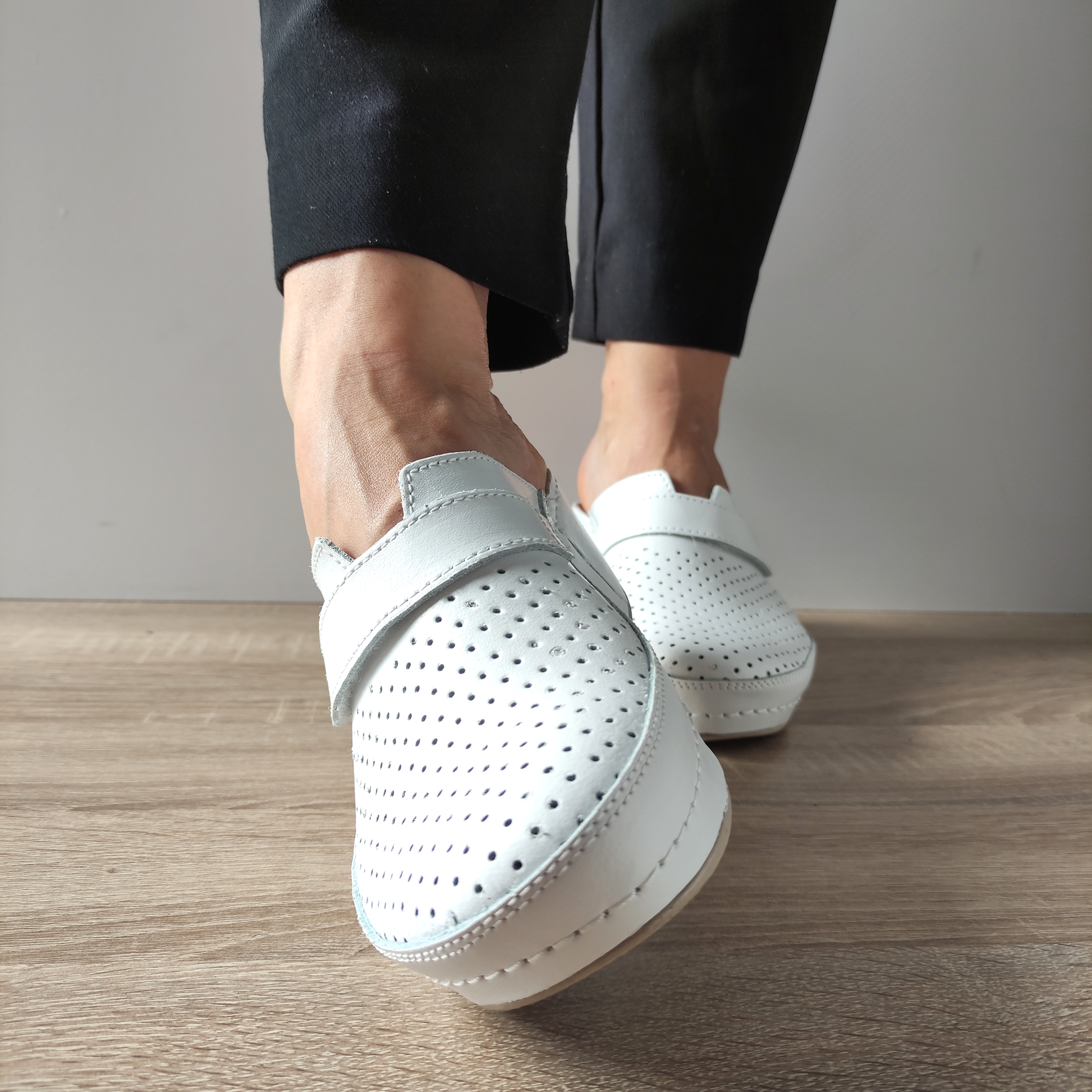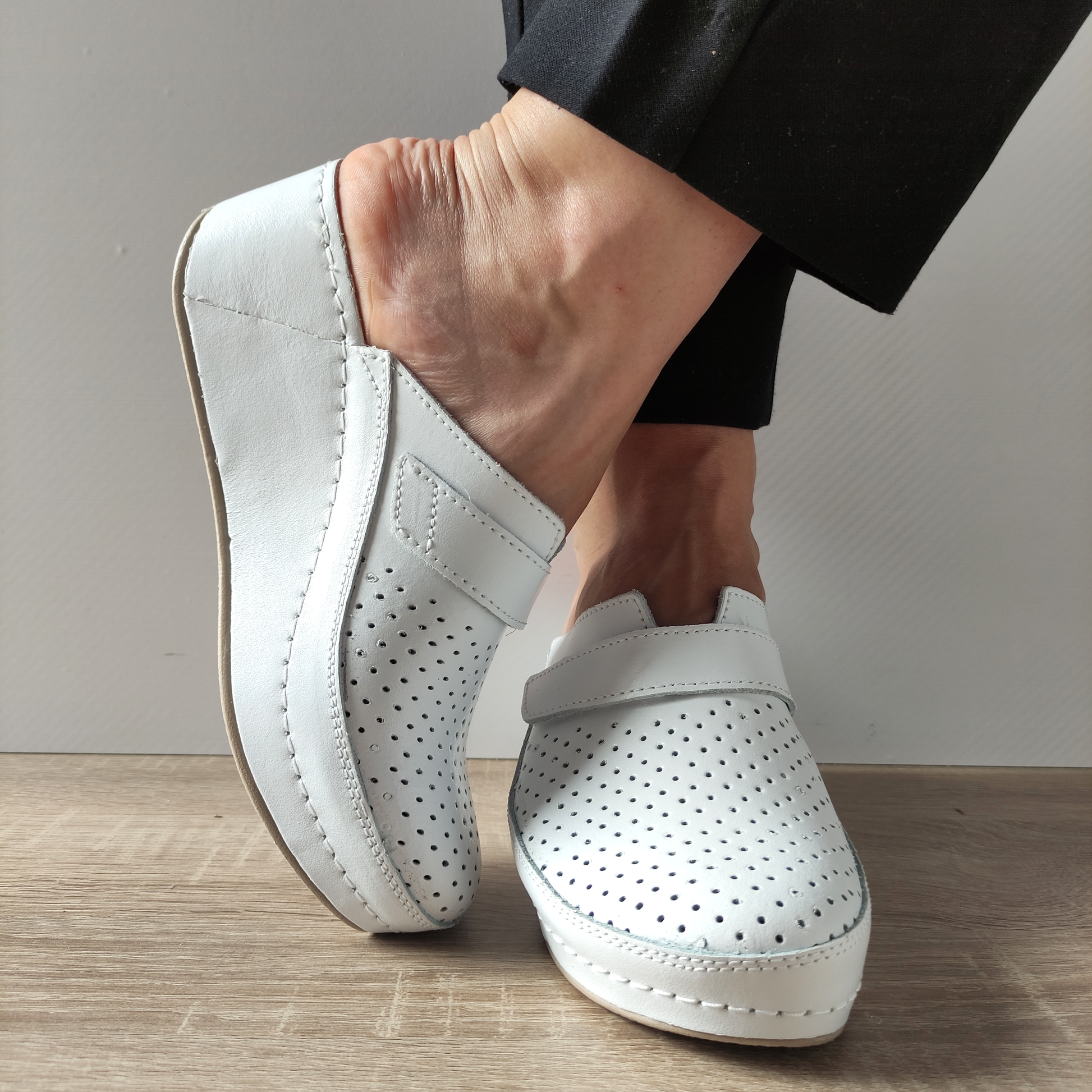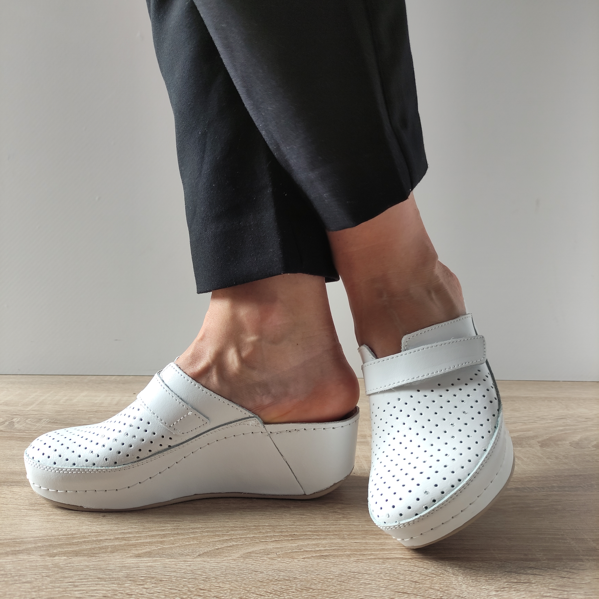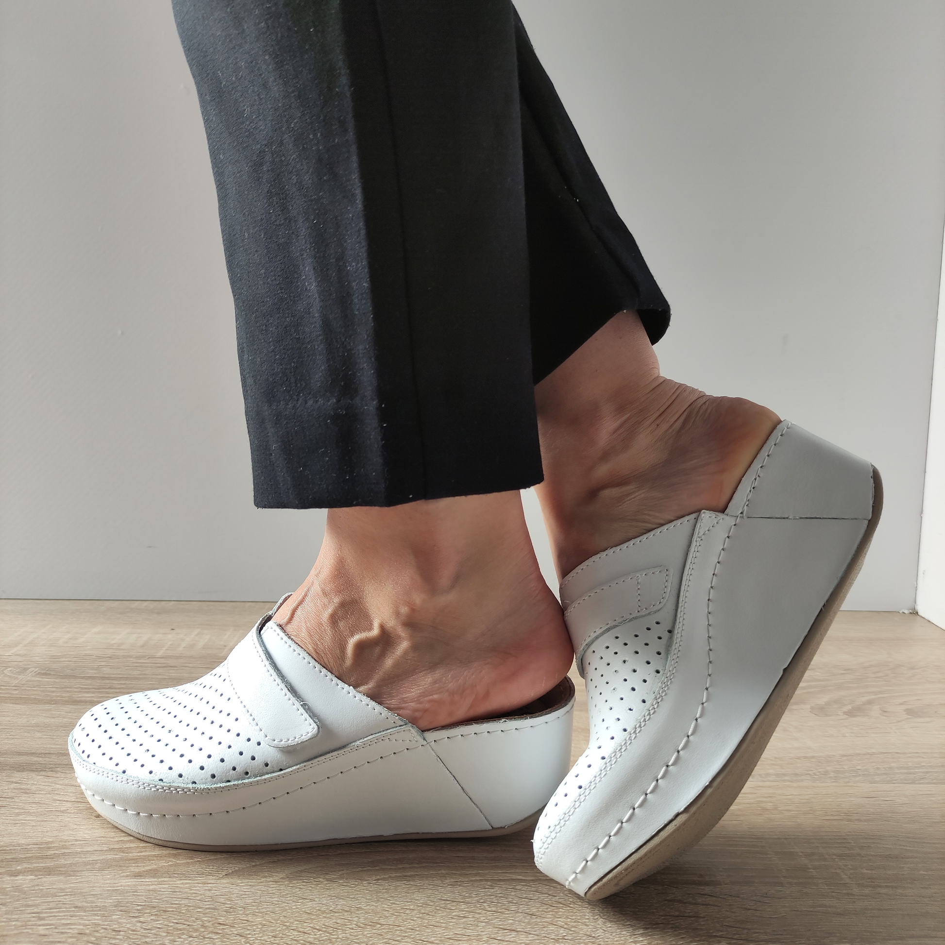 Îți prezentăm saboții medicinali pentru damă de la Fratelli, modelul D-130. Acești saboți sunt confecționați din piele naturală de culoare albă, oferind un aspect curat și profesional. Designul perforat permite o ventilație excelentă, ideală pentru utilizarea îndelungată. Sistemul de închidere slip-on asigură o fixare rapidă și confortabilă. Talpa de 5 centimetri și înălțimea totală a saboților de 10.5 centimetri oferă stabilitate și confort pe durata întregii zile.