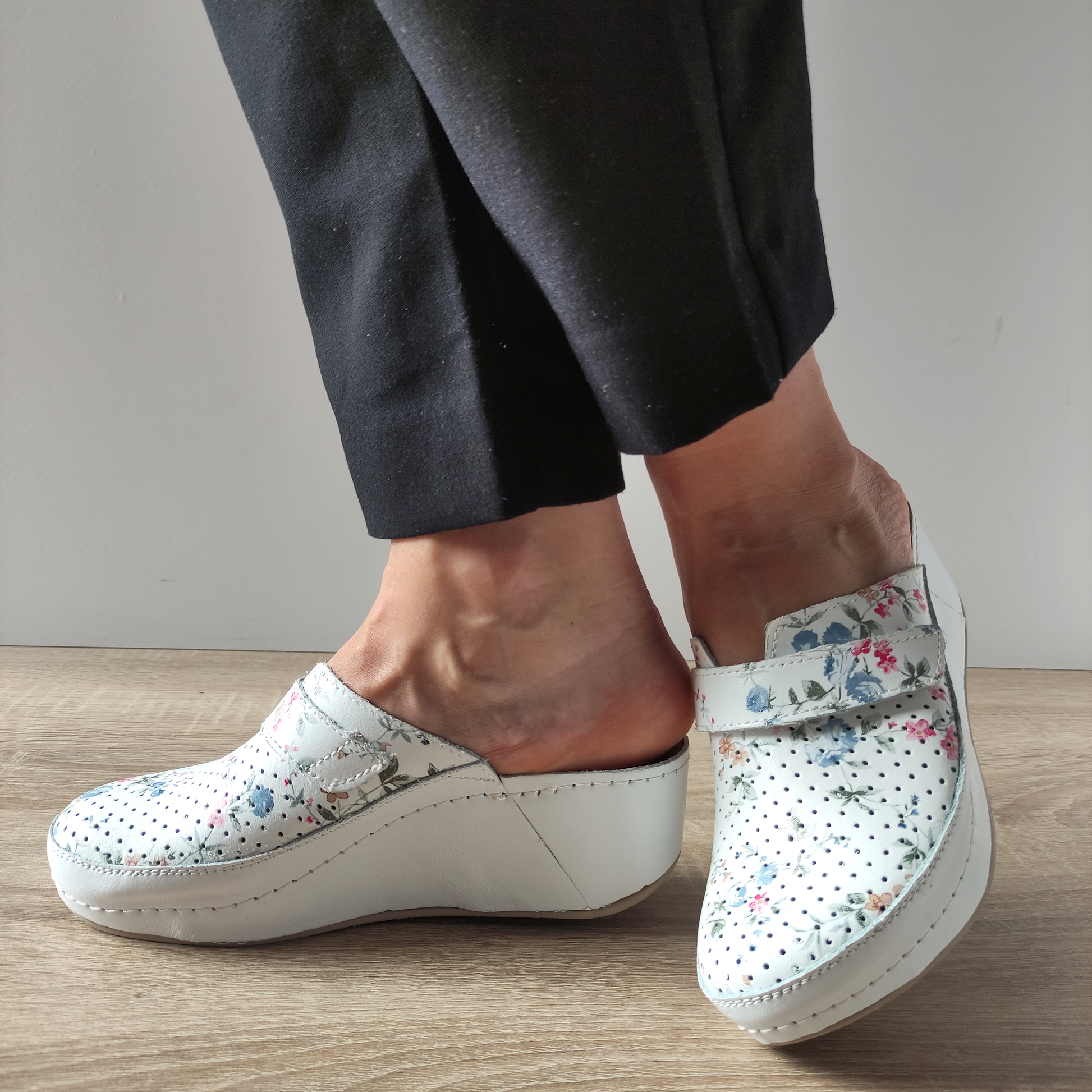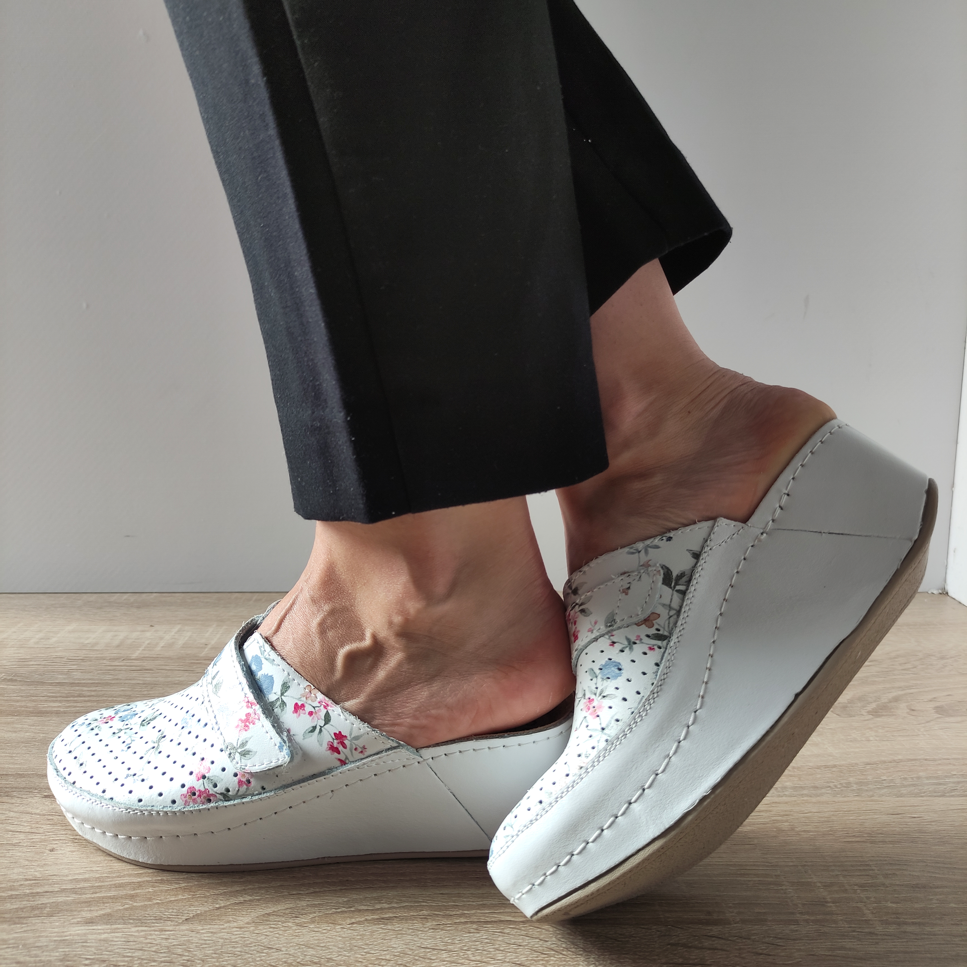 Material exterior: Piele naturală Tip închidere: Slip-on Tip: Saboți medicinali Gen: Damă Culoare: Alb + Floral Grosimea tălpii (toc): 5 centimetri Înălțimea totală a saboților: 10.5 centimetri Cod produs: FRATELLI D-130
