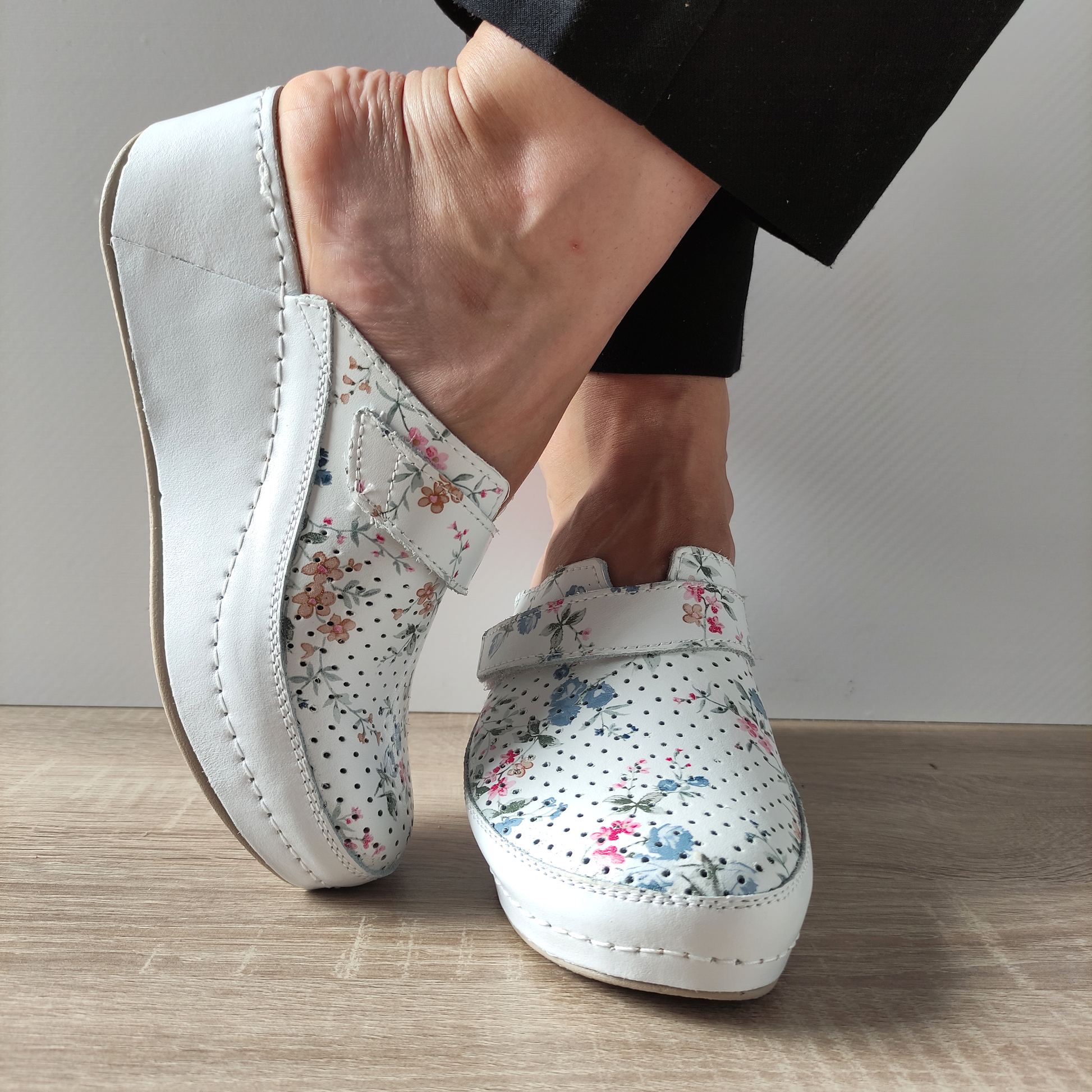 Îți prezentăm saboții medicinali pentru damă de la Fratelli, modelul D-130. Acești saboți sunt confecționați din piele naturală de culoare albă cu detalii florale, oferind un aspect vesel și atractiv. Designul perforat permite o ventilație excelentă, ideală pentru utilizarea îndelungată. Sistemul de închidere slip-on asigură o fixare rapidă și confortabilă. Talpa de 5 centimetri și înălțimea totală a saboților de 10.5 centimetri oferă stabilitate și confort pe durata întregii zile.