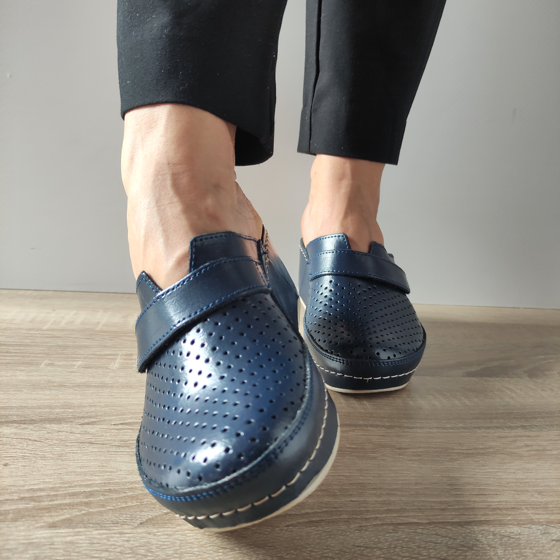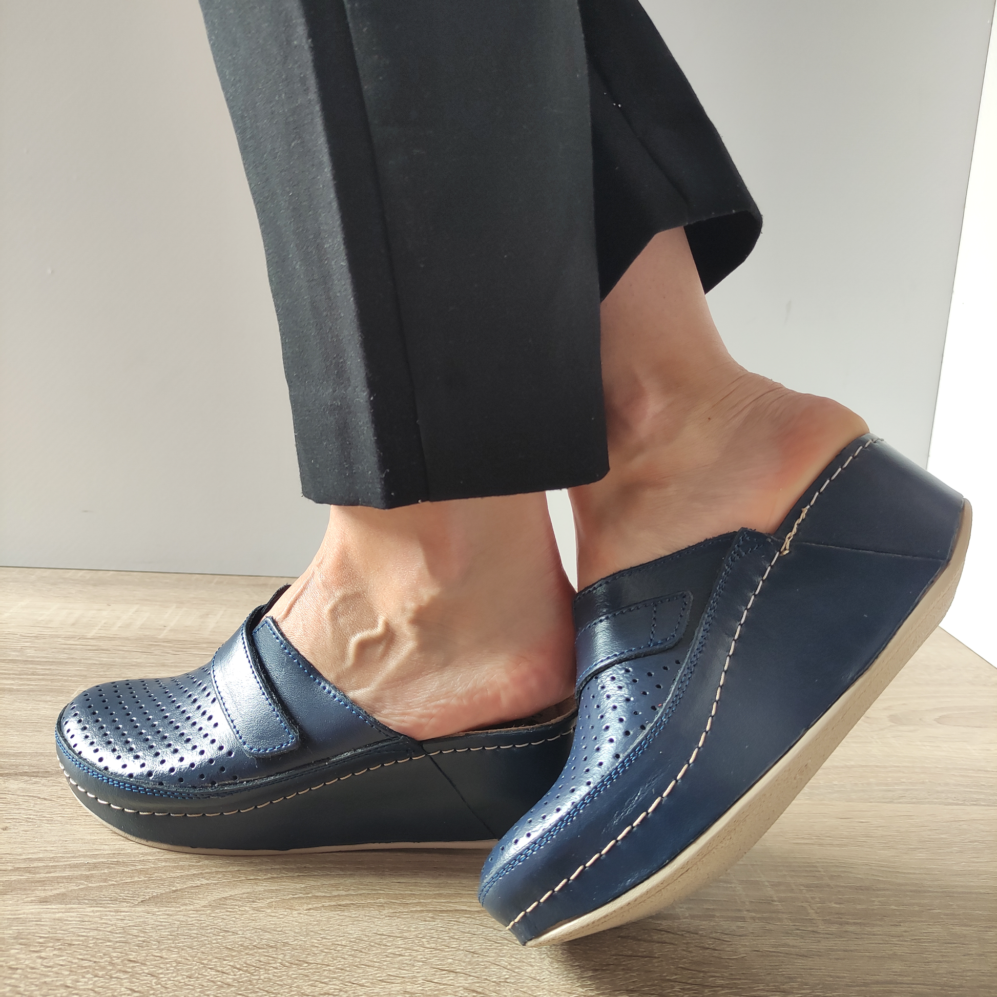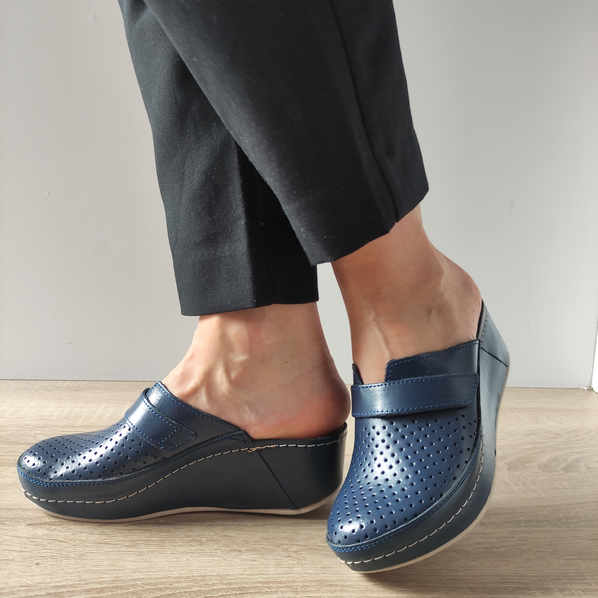 Îți prezentăm saboții medicinali pentru damă de la Fratelli Medicinali, modelul D-130. Acești saboți sunt confecționați din piele naturală de culoare bleumarin, oferind un aspect elegant și durabilitate. Designul perforat permite o ventilație excelentă, ideală pentru zilele călduroase. Sistemul slip-on asigură o încălțare rapidă și confortabilă. Talpa de 5 centimetri și înălțimea totală a pantofului de 10.5 centimetri oferă stabilitate și confort pe durata întregii zile.