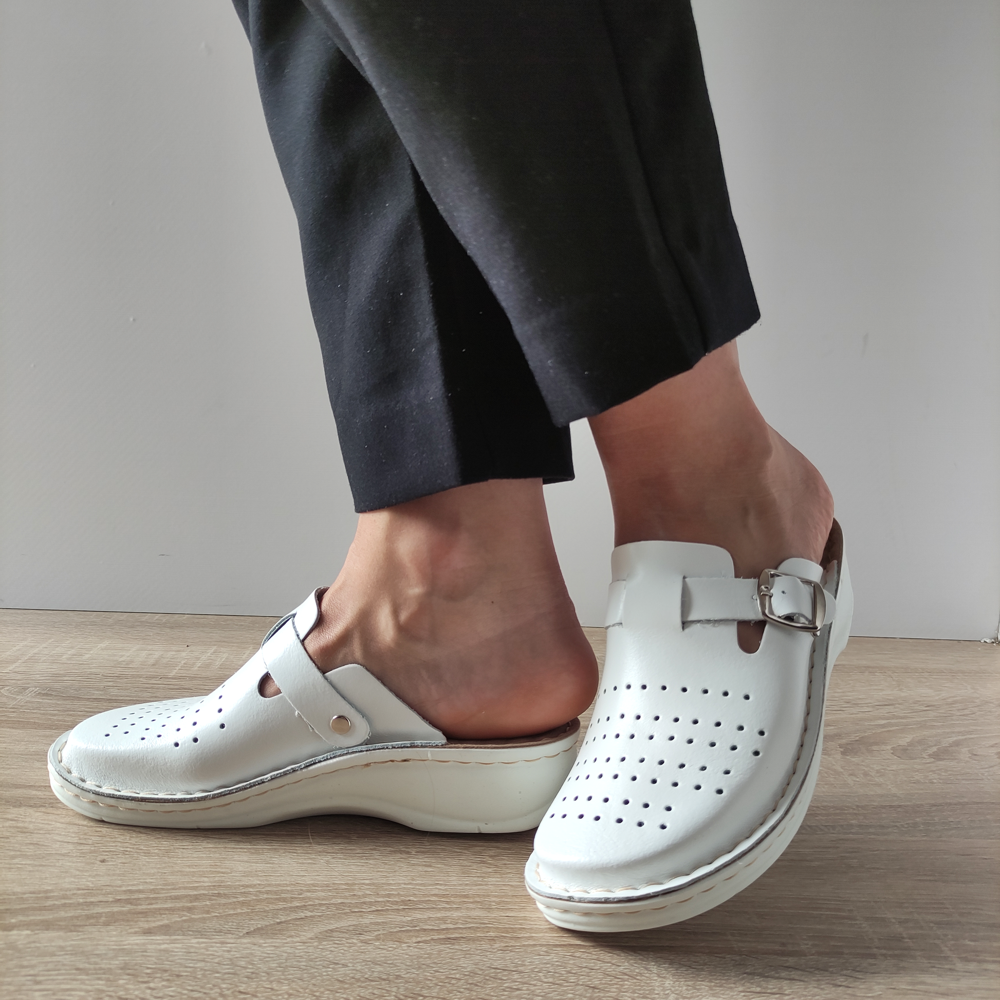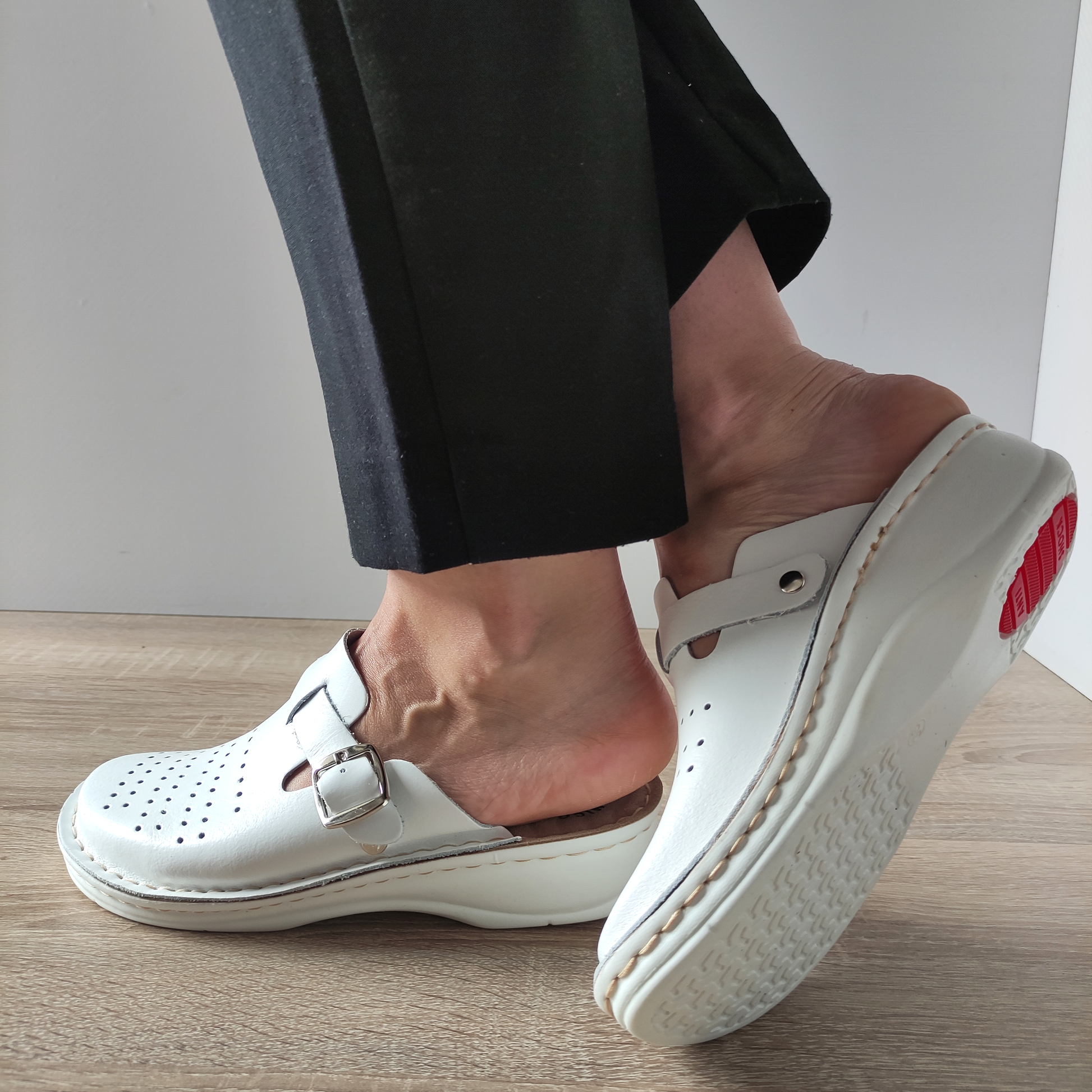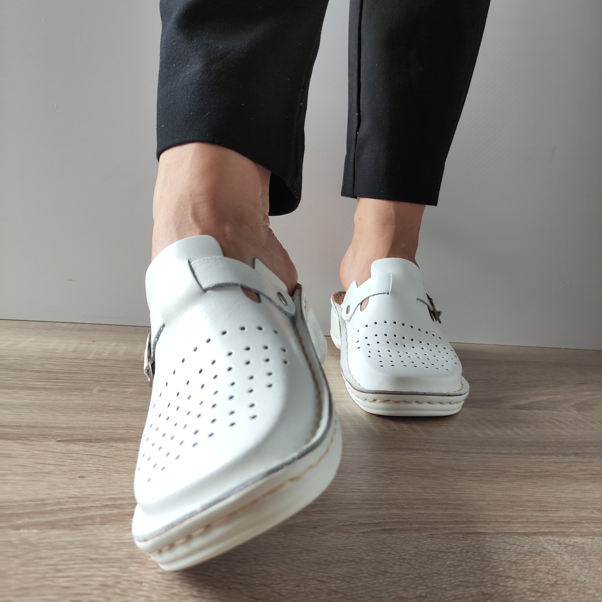 Îți prezentăm saboții medicinali pentru damă de la Fratelli, modelul D-52. Acești saboți sunt confecționați din piele naturală de culoare albă, oferind un aspect curat și profesional. Designul perforat permite o ventilație excelentă, asigurând confortul piciorului pe durata întregii zile. Sistemul slip-on facilitează o încălțare rapidă și ușoară. Talpa de 4 centimetri și înălțimea totală a saboților de 10 centimetri oferă stabilitate și suport optim pentru activitățile zilnice.