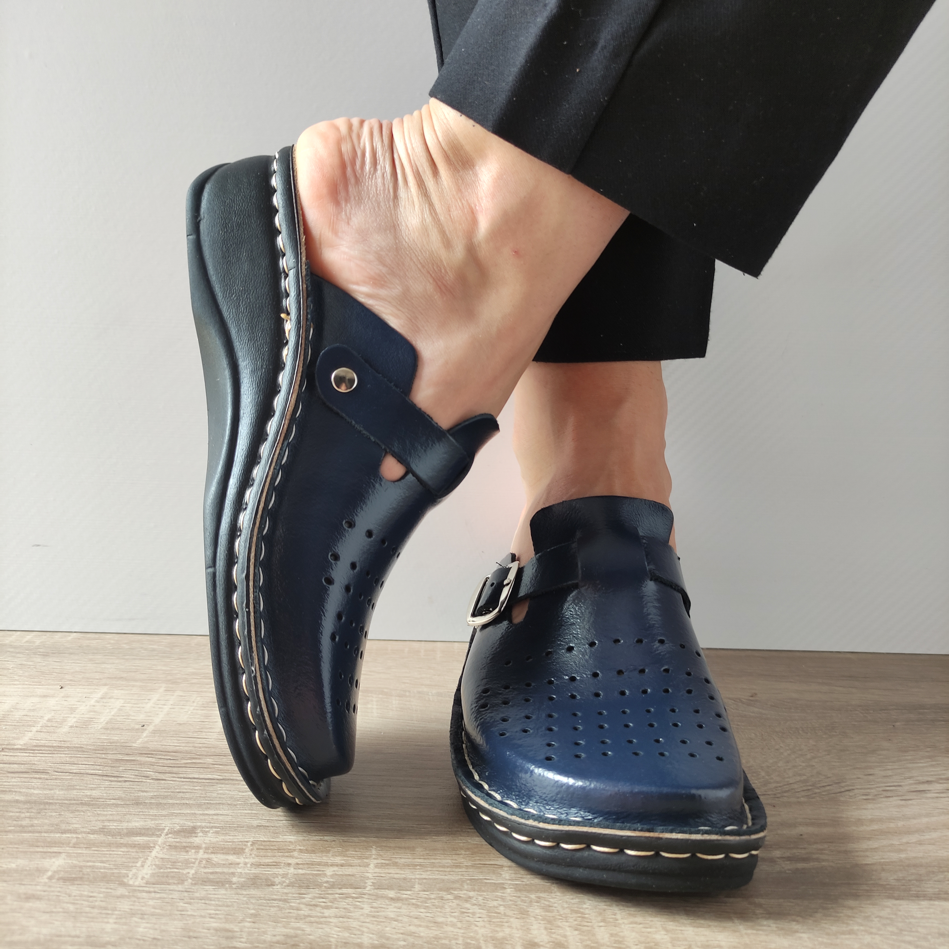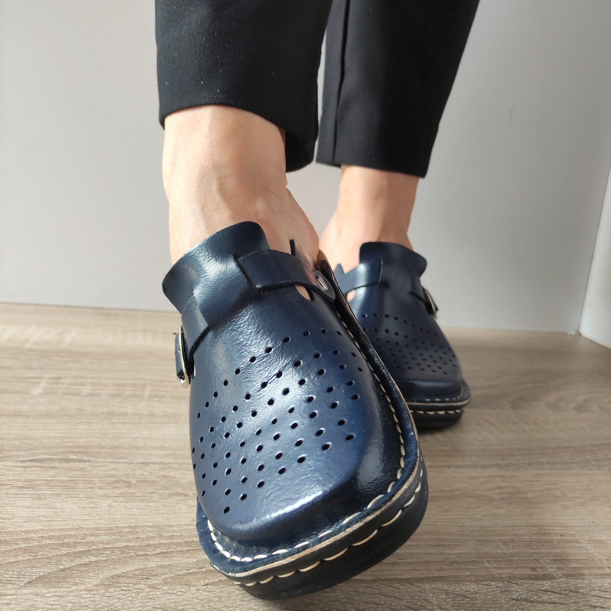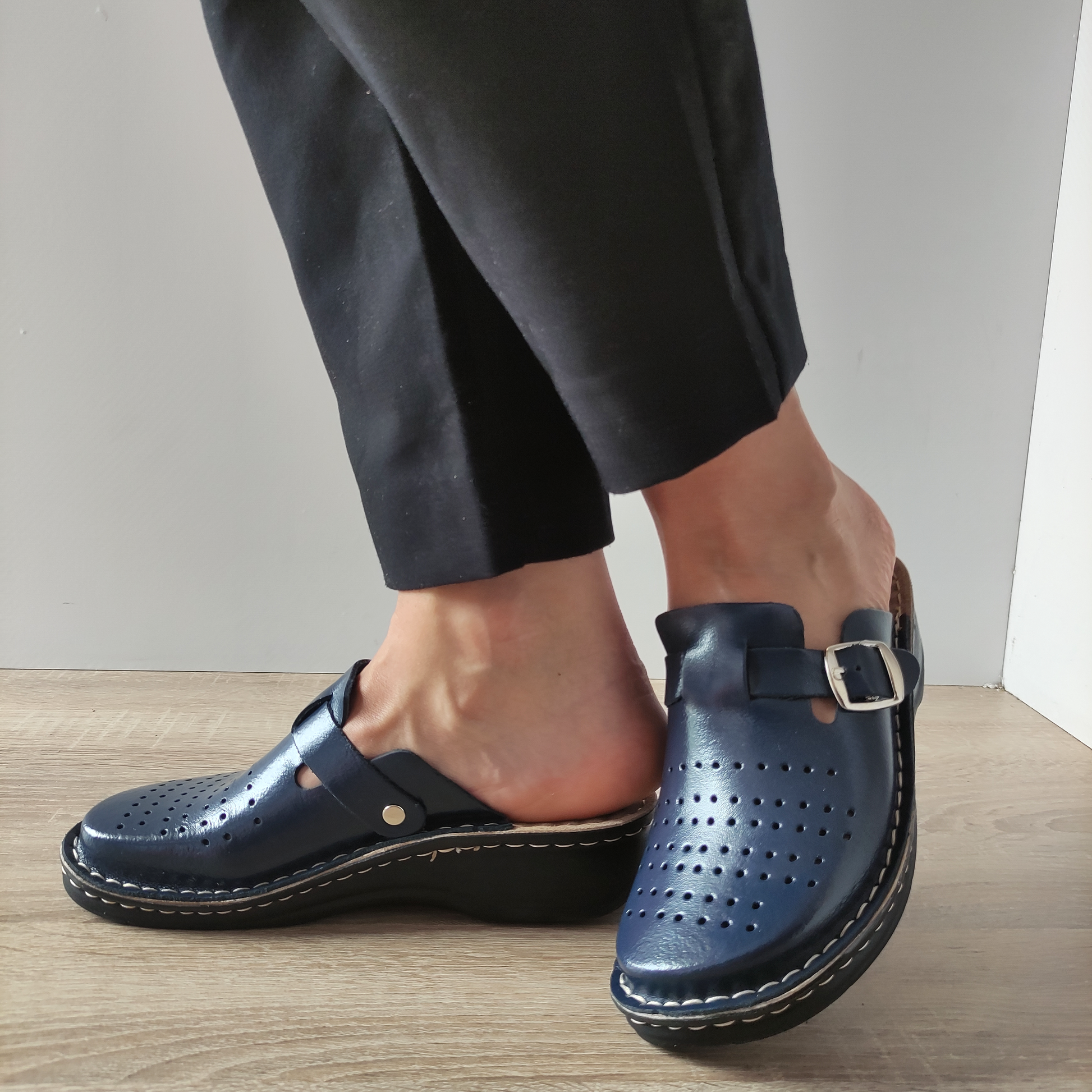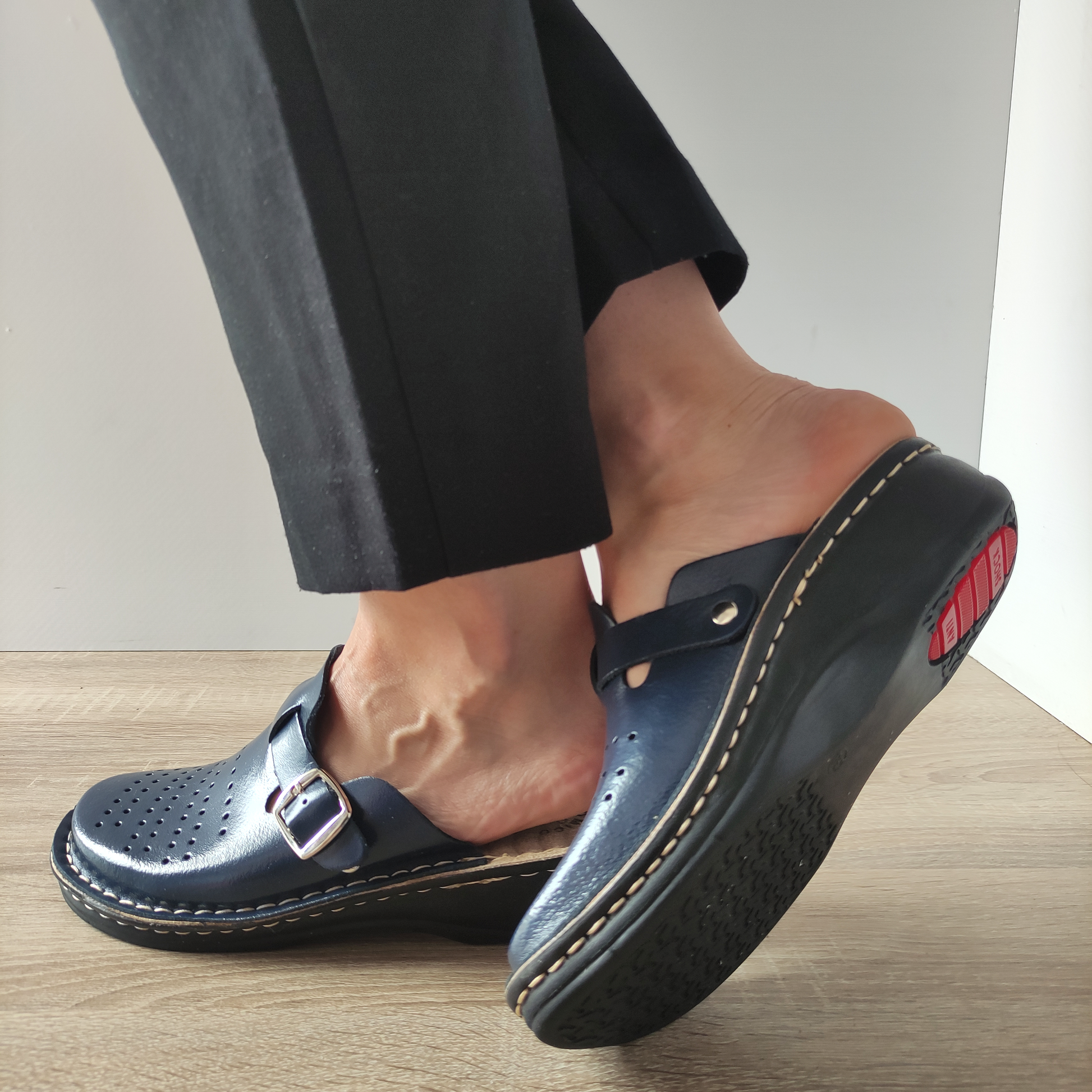 Îți prezentăm saboții medicinali pentru damă de la Fratelli, modelul D-52. Acești saboți sunt confecționați din piele naturală de culoare bleumarin, oferind un aspect elegant și modern. Designul perforat permite o ventilație excelentă, ideală pentru utilizarea îndelungată. Sistemul de închidere slip-on asigură o fixare rapidă și confortabilă. Talpa de 4 centimetri și înălțimea totală a saboților de 10 centimetri oferă stabilitate și confort pe durata întregii zile.