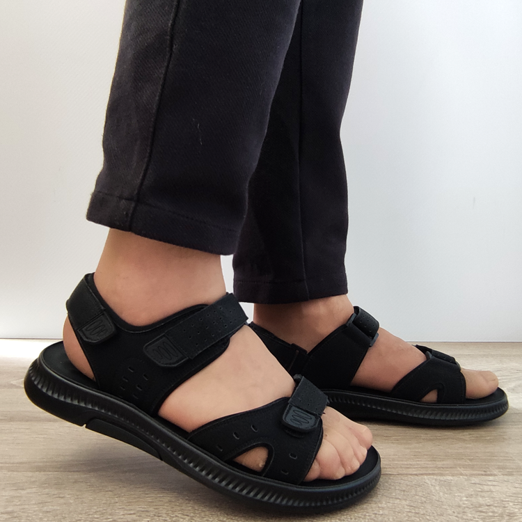 Material exterior: Piele naturală bufo Tip închidere: Velcro (scai) Tip: Sandale casual Gen: Bărbați Culoare: Negru Grosimea tălpii (toc): 3 centimetri Înălțimea totală a pantofului: 10.5 centimetri Cod produs: MELS 1S13