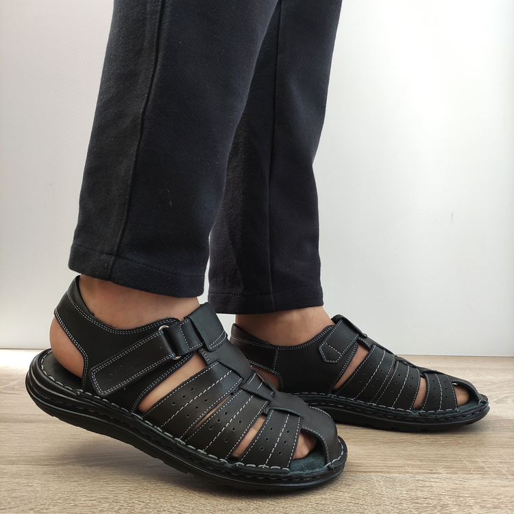 Îți prezentăm sandalele casual pentru bărbați de la Nicolis, modelul 75405. Aceste sandale sunt confecționate din piele naturală de culoare neagră, oferind un aspect elegant și durabilitate. Designul cu sistem de închidere Velcro (scai) asigură o fixare sigură și rapidă. Înălțimea totală a sandalei este de 10.5 centimetri, iar talpa are o grosime de 2.8 centimetri, oferind confort și stabilitate pe durata întregii zile.