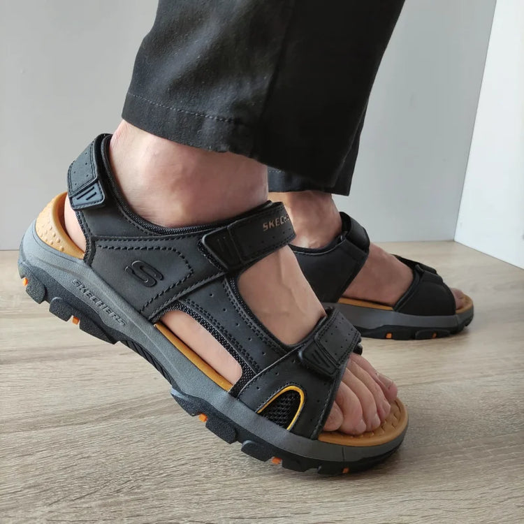 Descriere: Sandalele casual pentru bărbați Skechers 204106, în nuanță negru cu accente portocalii, combină perfect stilul sportiv cu funcționalitatea de zi cu zi. Realizate din piele ecologică rezistentă, sunt echipate cu barete late și prindere cu Velcro (scai), oferind o fixare rapidă și reglabilă. Talpa groasă și robustă, cu grosime de 4 cm la spate, oferă aderență și stabilitate în orice condiții. Designul cu decupaje multiple asigură ventilație excelentă, iar înălțimea totală de 11 cm oferă suport suficient pentru glezne fără a limita mișcarea.